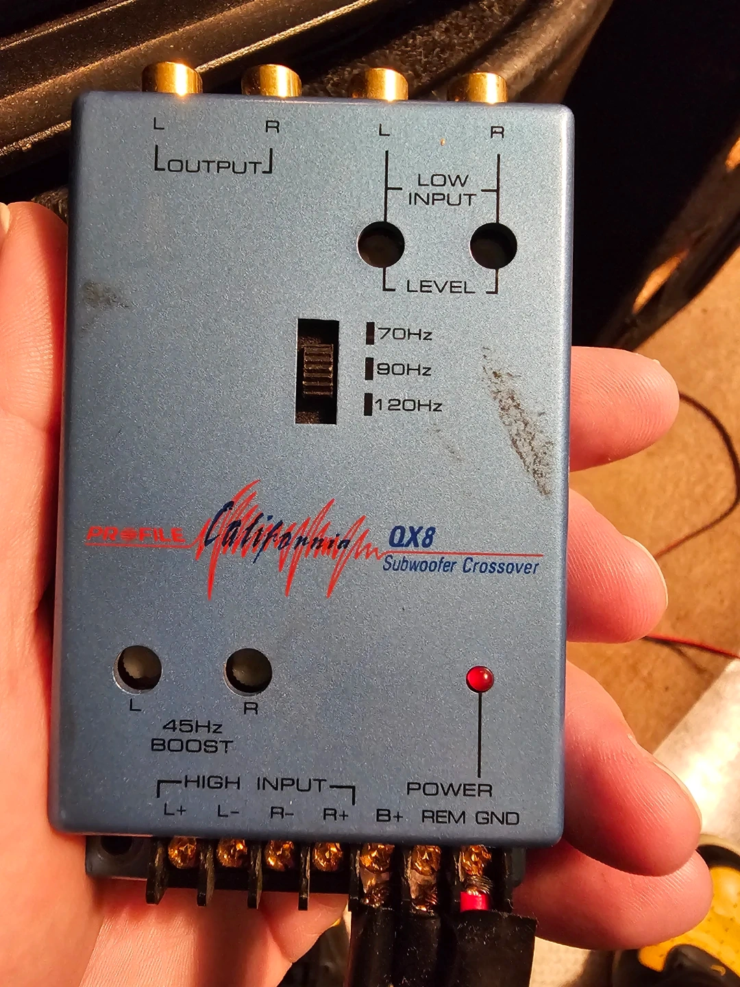 Selling a Legacy California QX8 Subwoofer Crossover. It has settings for 70Hz, 90Hz, and 120Hz, plus a 45Hz boost. Perfect for enhancing your car audio system!