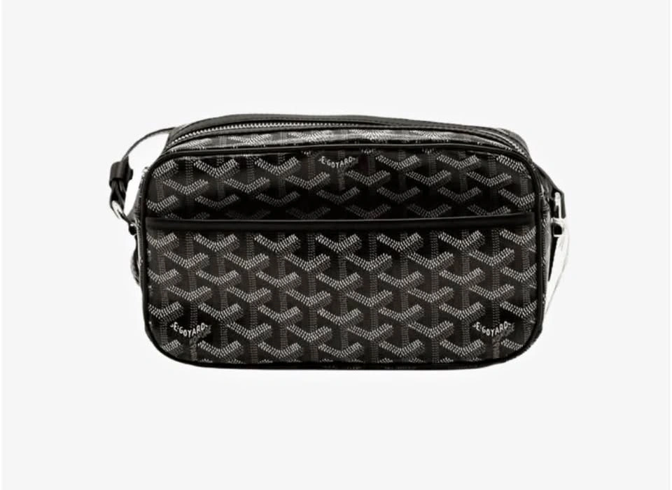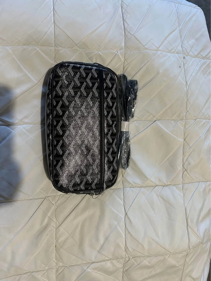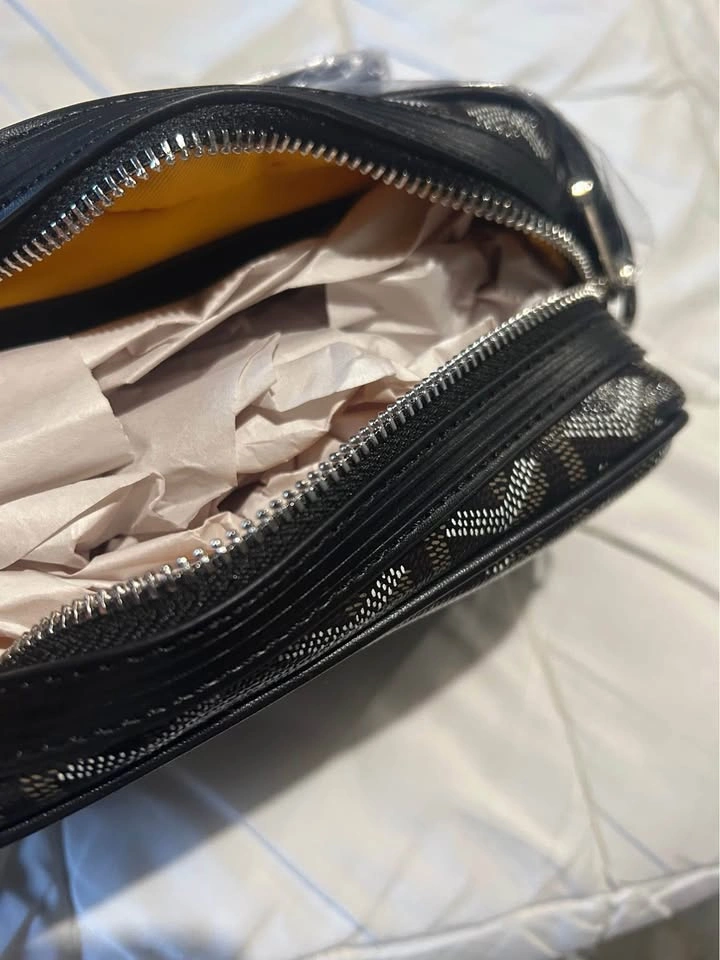 Goyard crossbody side bag in classic black chevron pattern. Comes with the original Goyard dust bag (233 Rue St-Honoré, Paris) and protective packaging.