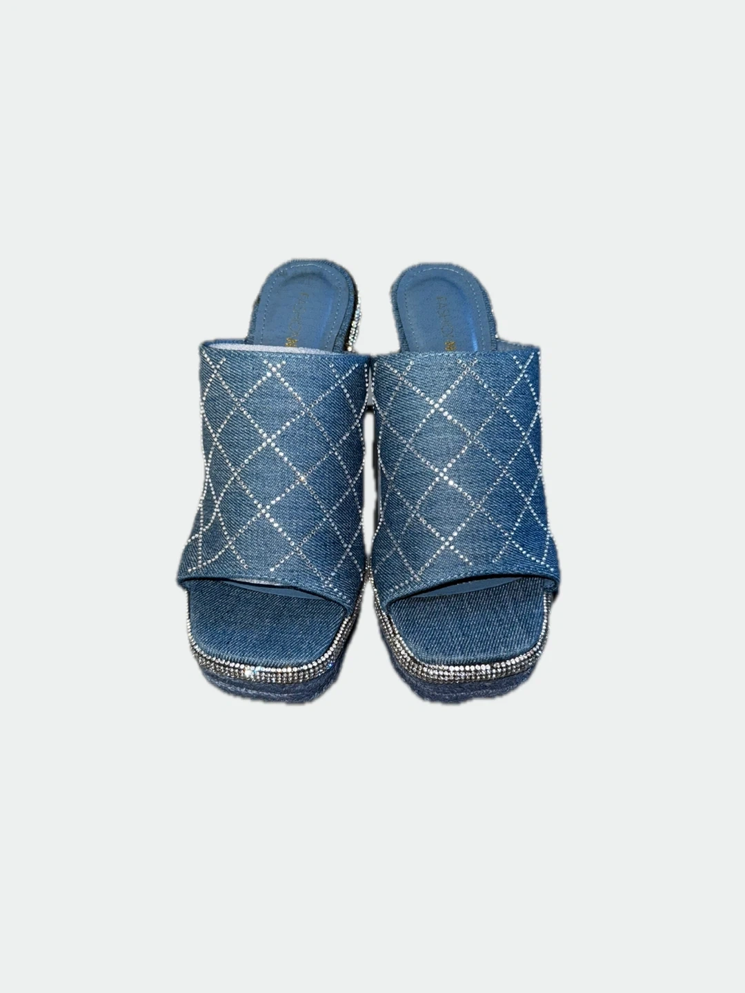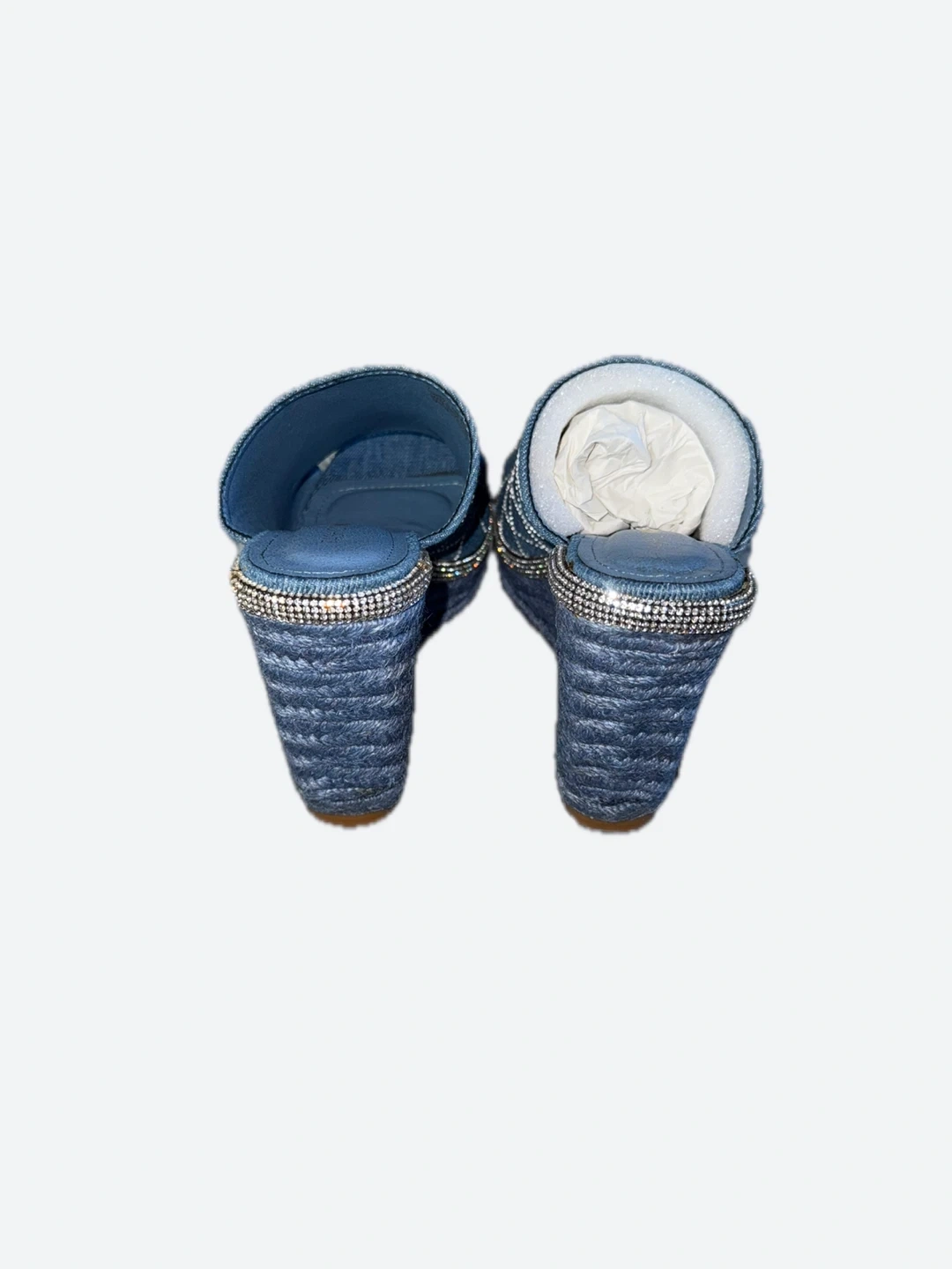 Blue Denim Rhinestone Wedge Mules - Size 7