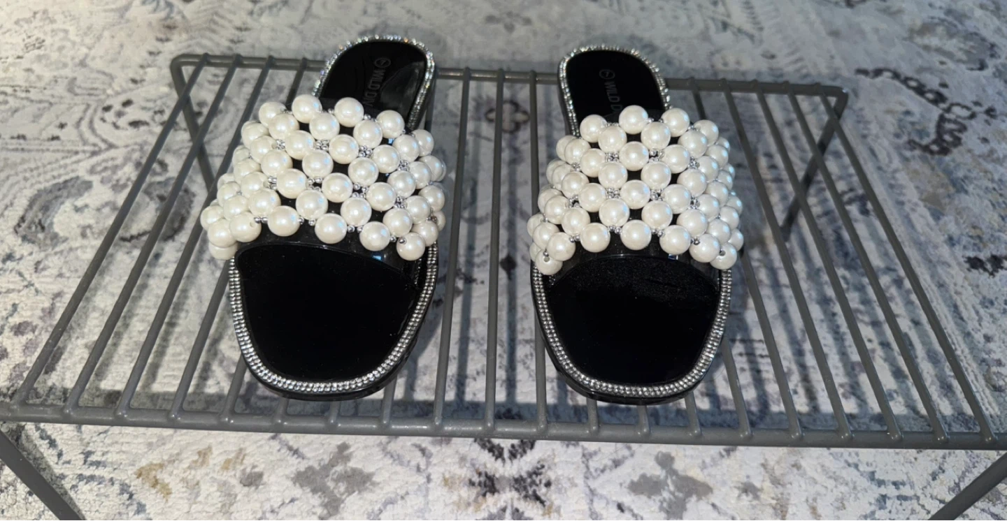 Cute Wild Diva Lounge slides in size 7! These feature a black base with pearl embellishments. Perfect for adding a touch of elegance to your casual outfits
