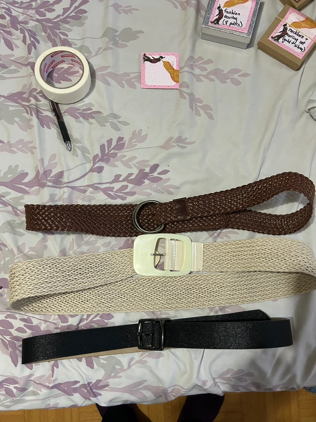 Selling a set of three assorted belts. There's a brown woven belt with a circular buckle, a beige woven belt with a square buckle, and a black belt with a classic buckle. All in good condition!