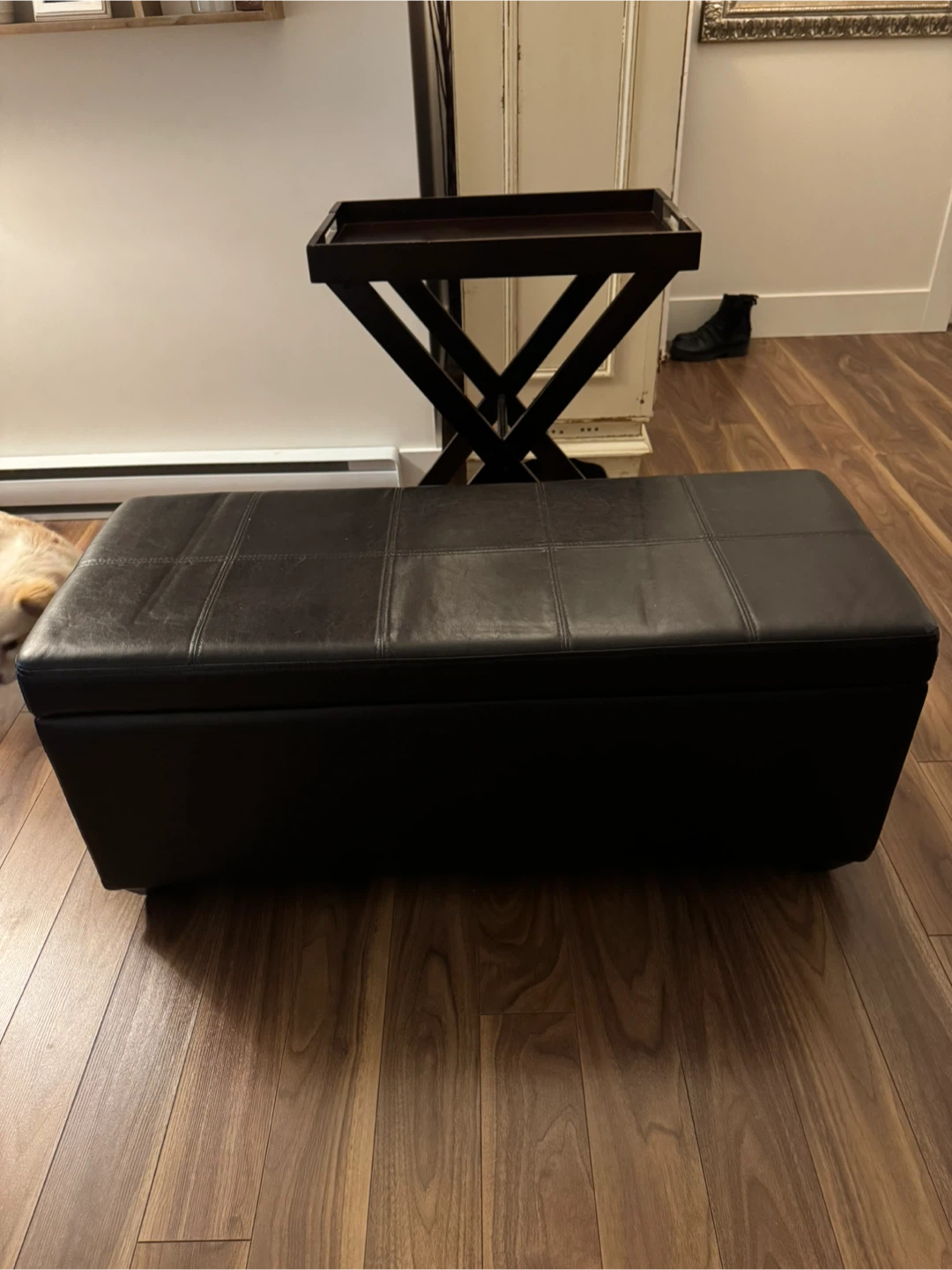 Selling a dark brown storage ottoman bench. It's in excellent condition and perfect for adding extra seating and storage to any room. The top lifts up to reveal a spacious storage compartment, ideal for blankets, pillows, or other household items (table tray in photo is sold).