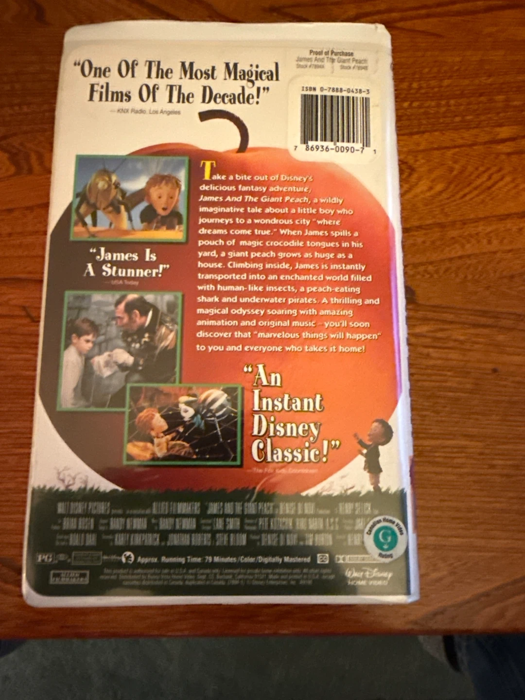 Selling a VHS copy of Walt Disney Pictures' "James and the Giant Peach"! This classic movie is ready for a new home. Perfect for collectors or anyone who loves a bit of Disney magic!