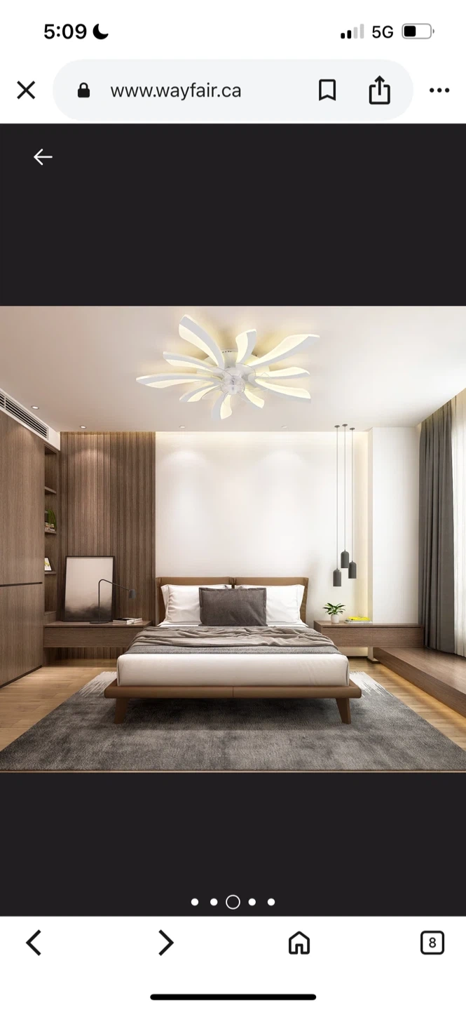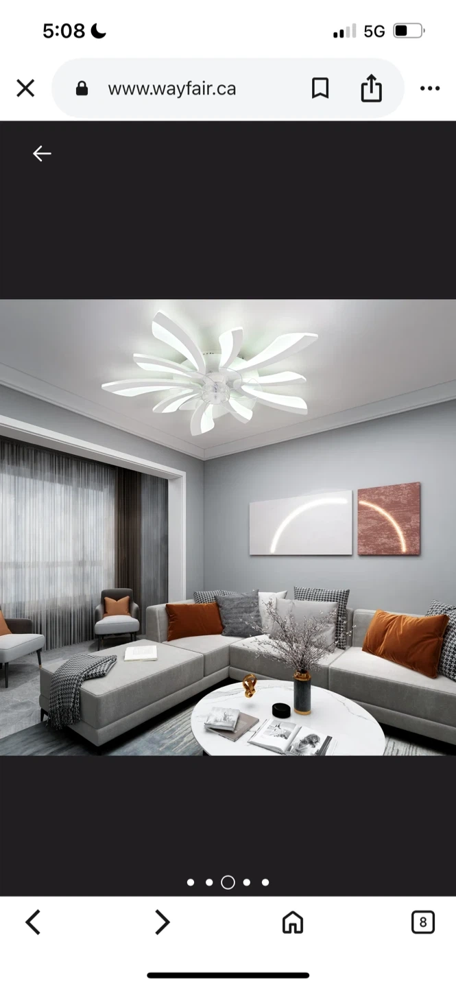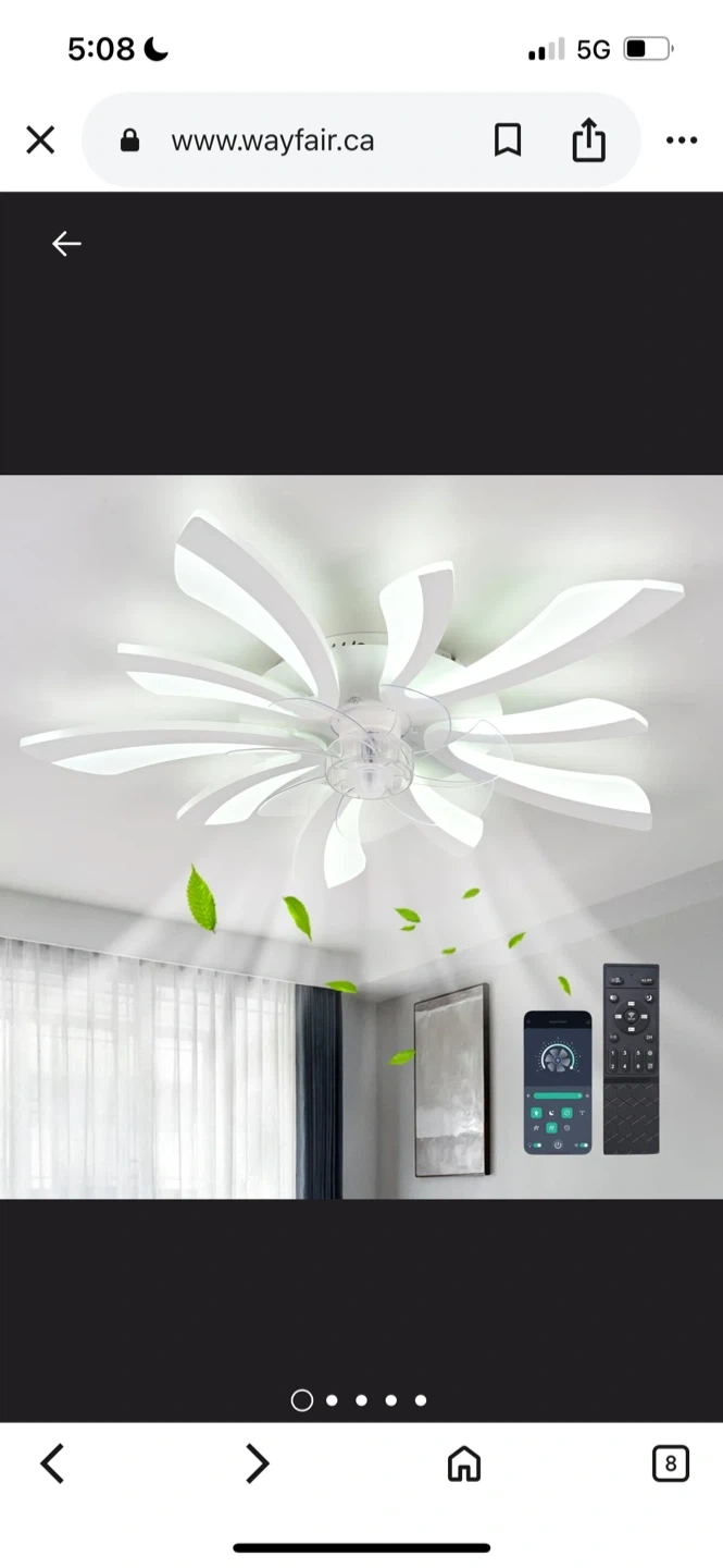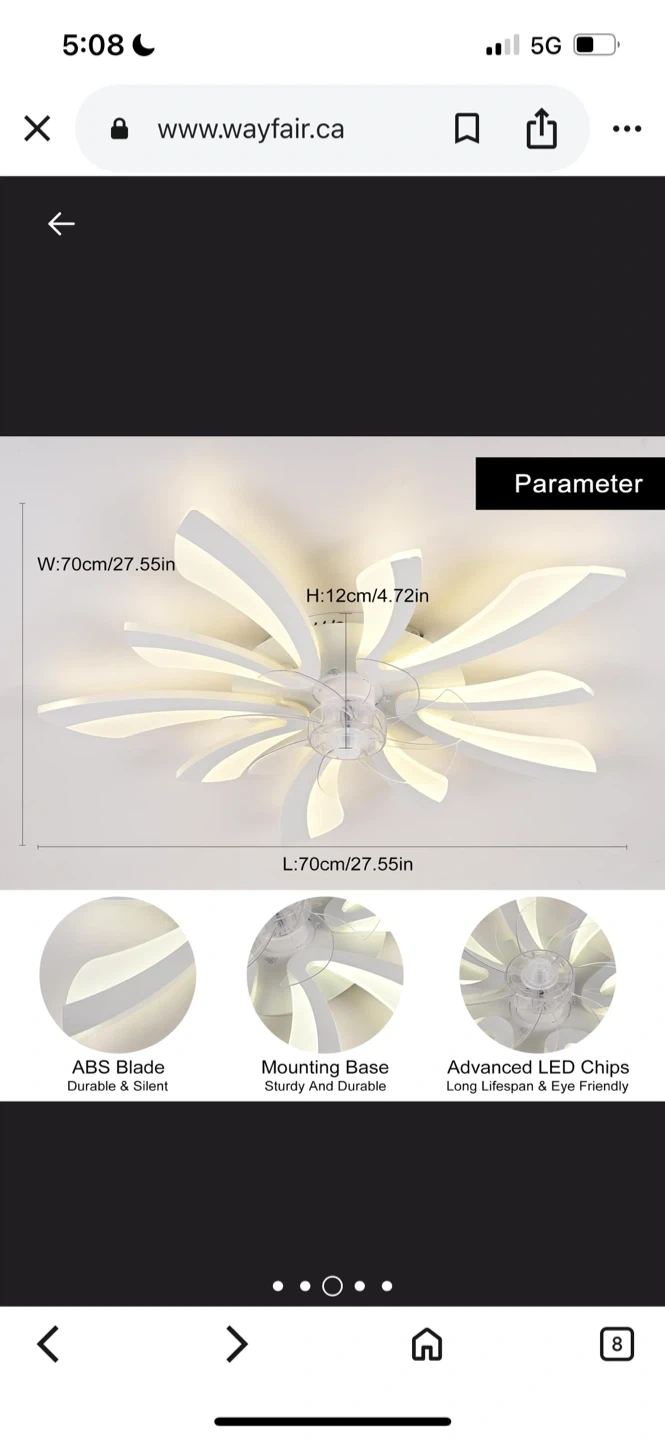 137Wayfare Price $187.99 Selling a modern LED ceiling fan with a unique flower design! It's white and comes with a remote control. The blades are made of durable and silent ABS material. It also features advanced LED chips that are long-lasting and eye-friendly. Dimensions are 70cm (27.55in) in width and length, and 12cm (4.72in) in height