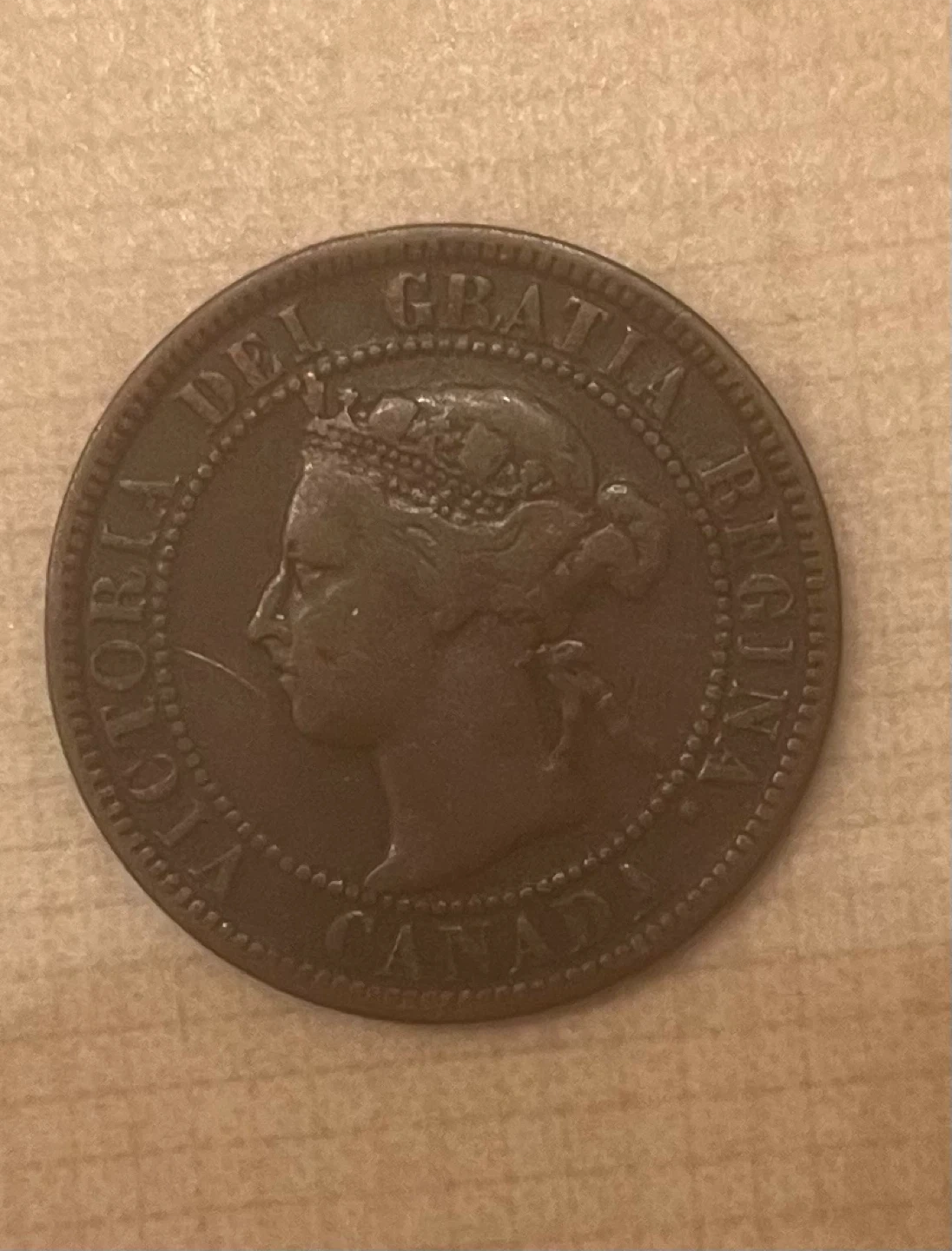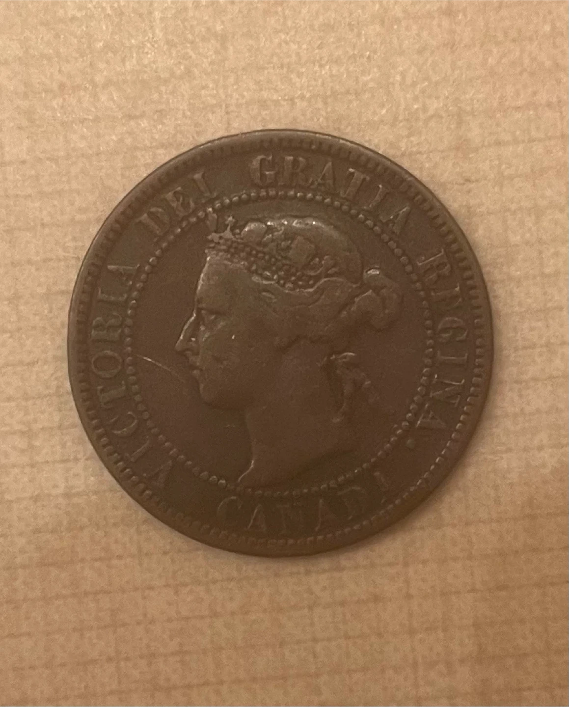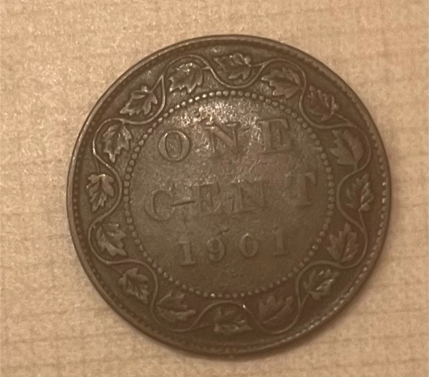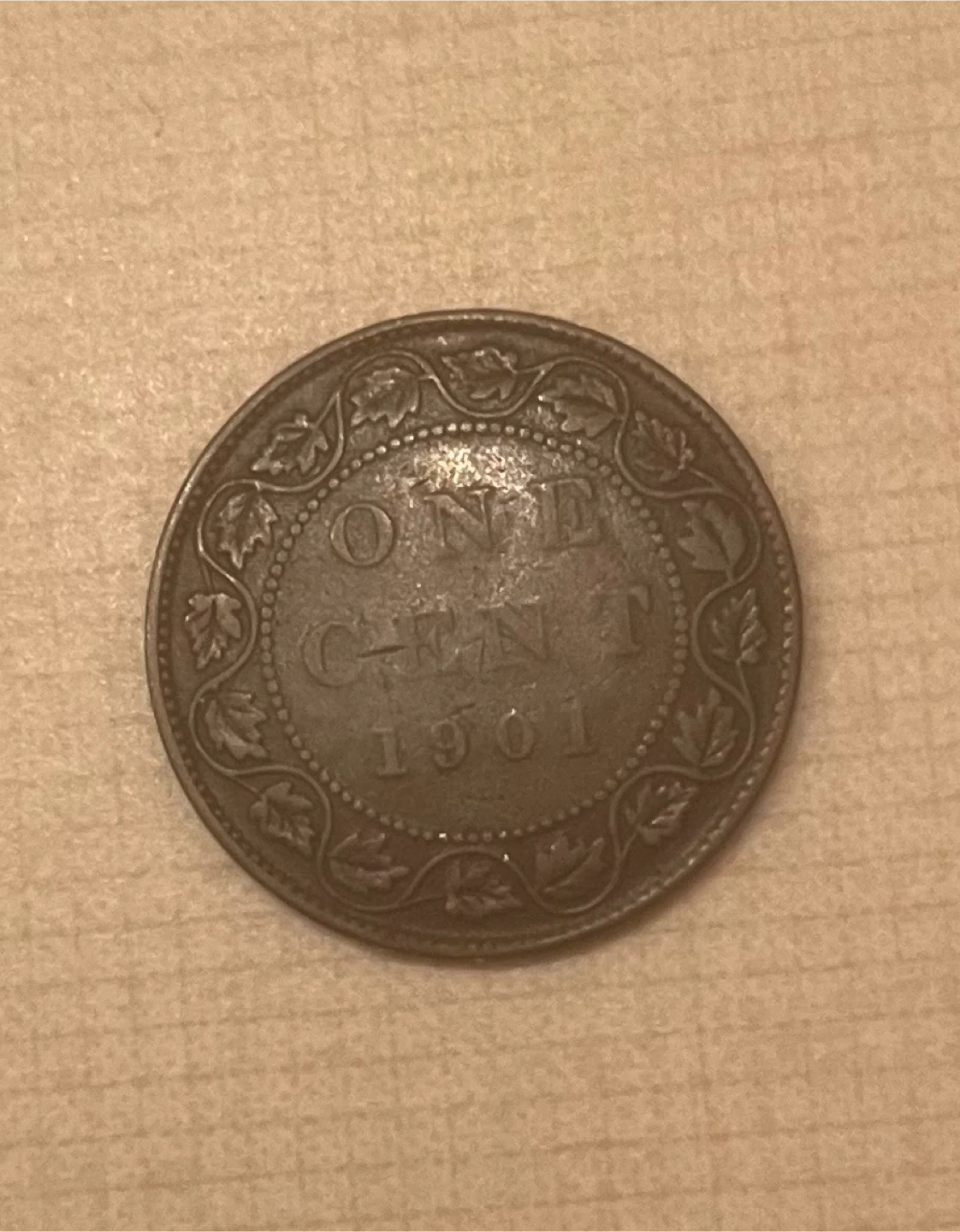 258Selling a Canadian one cent coin from 1901. It has a beautiful design with maple leaves and the inscription 'ONE CENT' on one side, and Queen Victoria on the other. A piece of Canadian history!