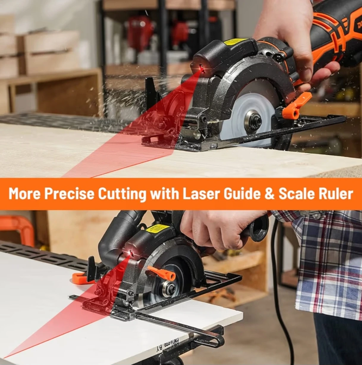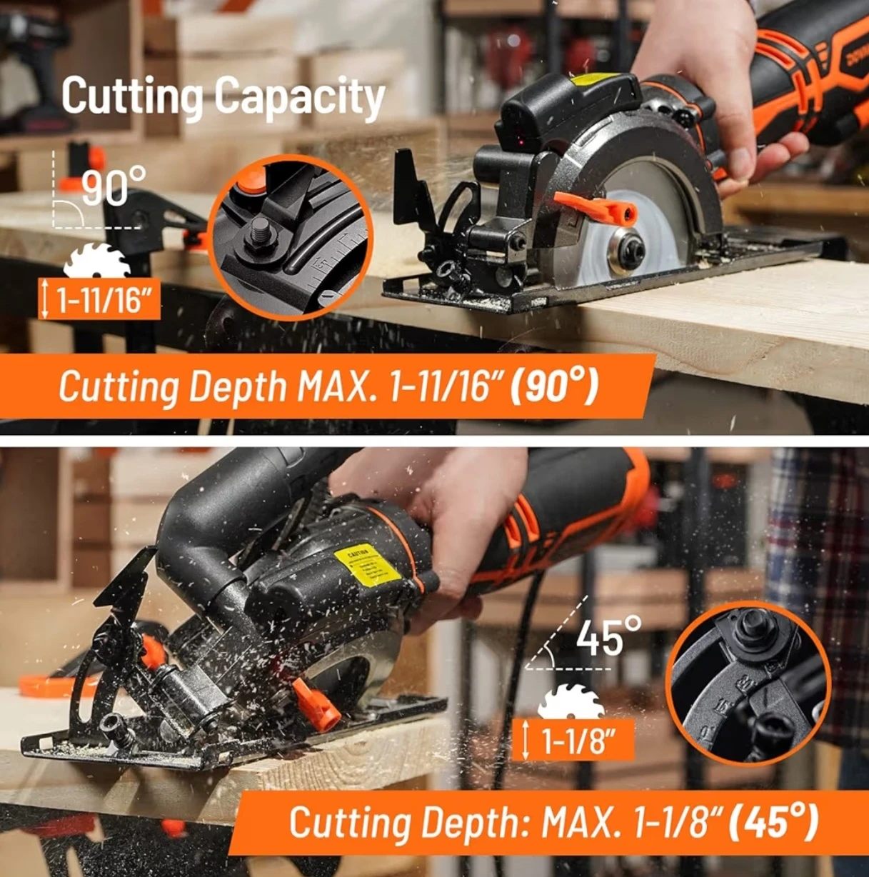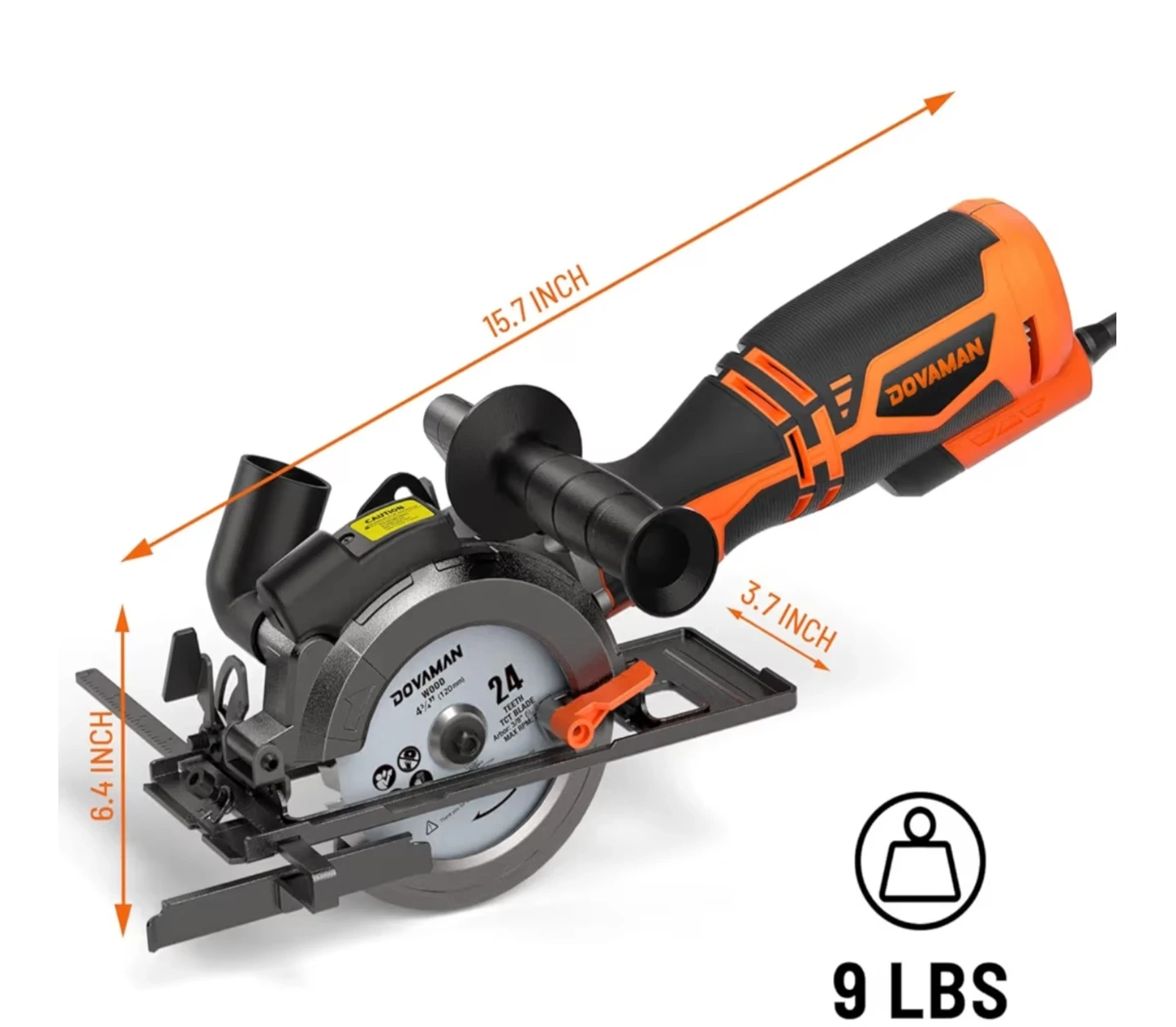 92This is a DOVAMAN mini compact circular saw. It features an auxiliary metal handle for more stable and easier cutting, and a laser guide and scale ruler for more precise cutting. Key Specifications: - Cutting Depth MAX: 1-11/16" (90°) - Cutting Depth MAX: 1-1/8" (45°) - Dimensions: 15.7 inch x 3.7 inch x 6.4 inch - Weight: 9 lbs