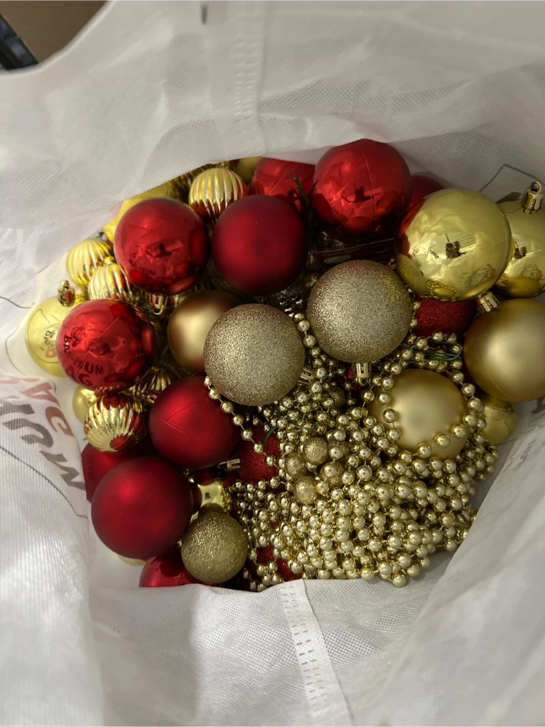 Selling a bag full of Christmas ornaments. Lots of red and gold colours. Perfect for decorating your tree!