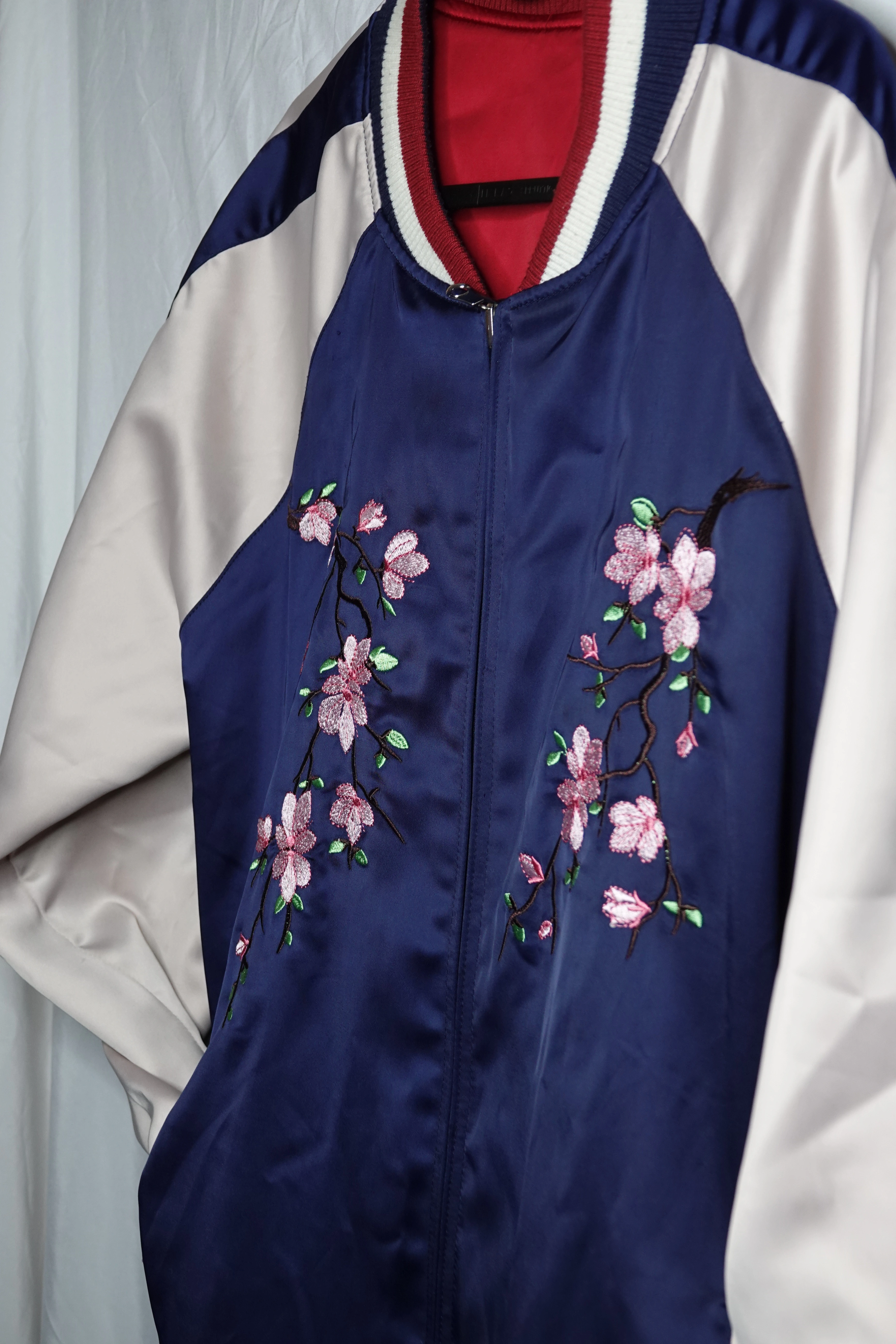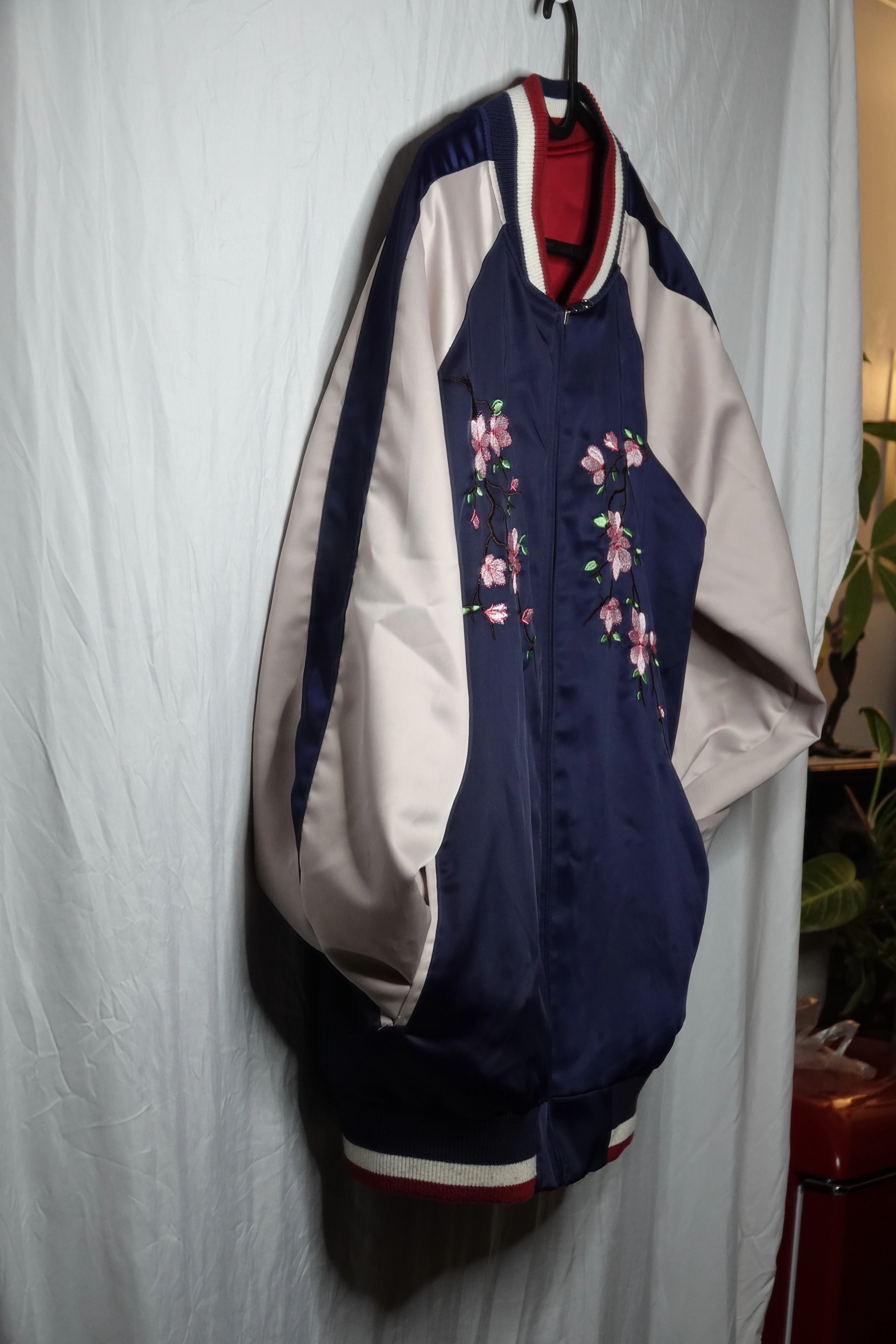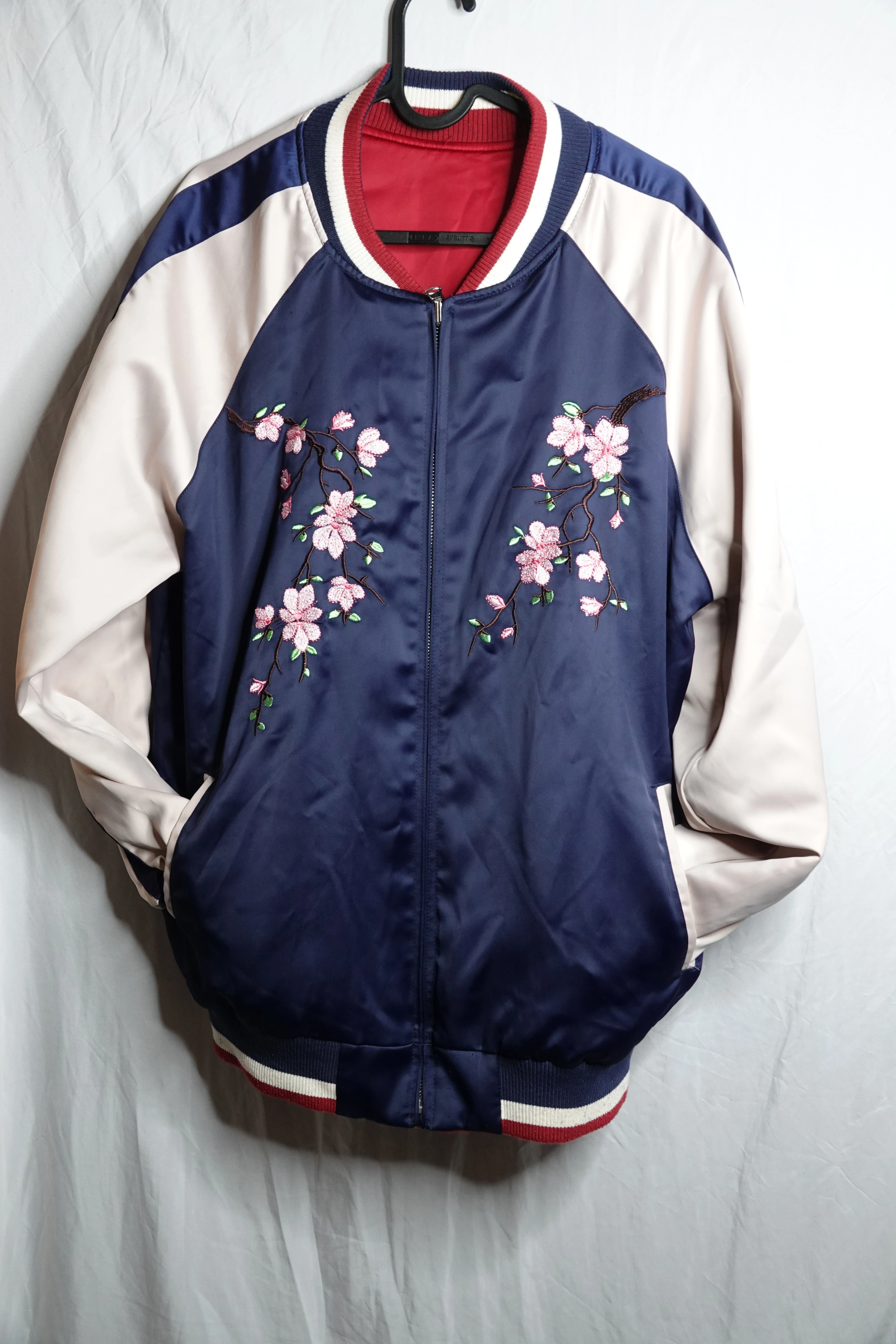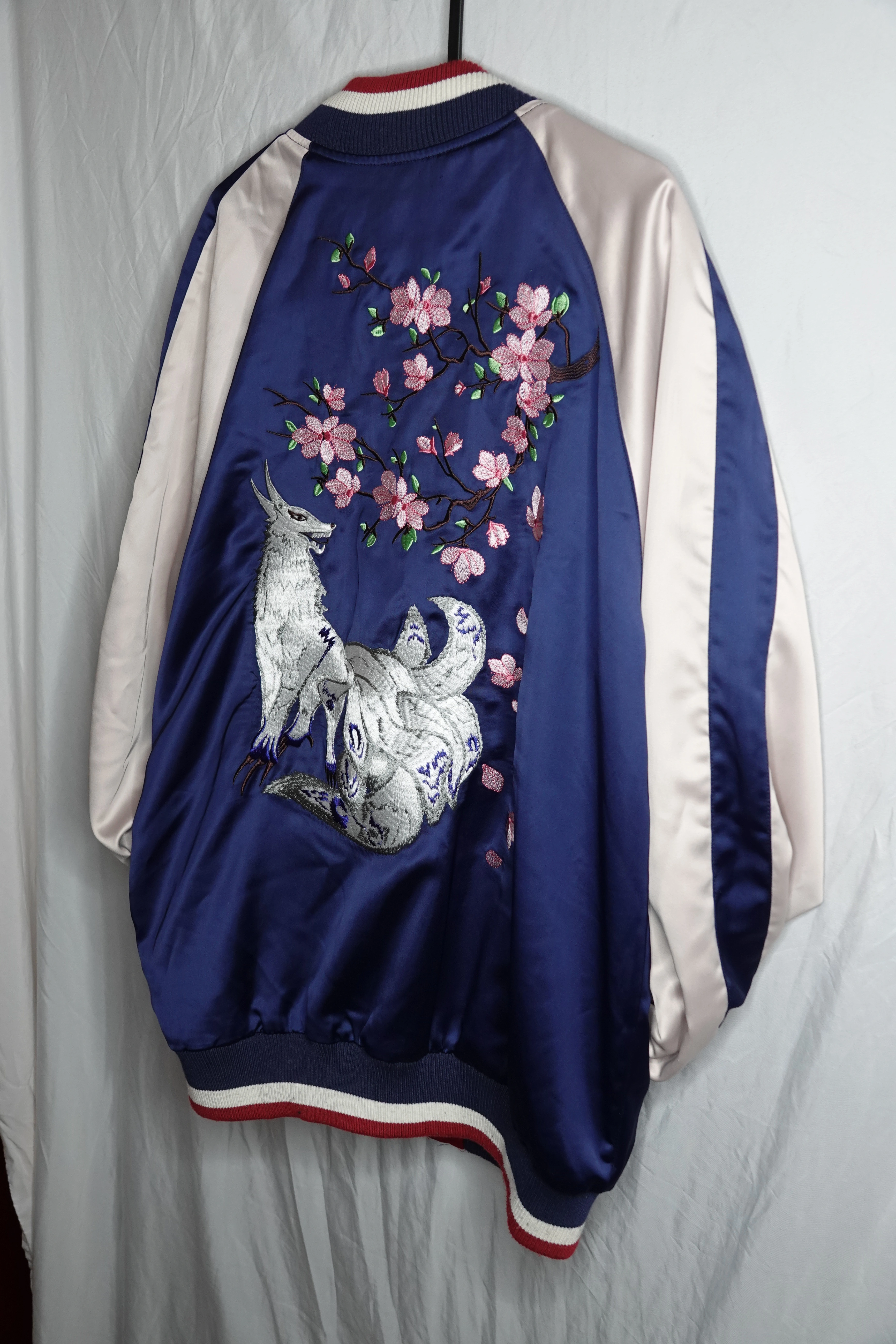 Striking souvenir-style bomber jacket: navy blue body, ivory satin sleeves, red/white/blue striped collar and hem. Features detailed embroidered cherry blossoms and nine-tailed fox (kitsune) on the back, with matching blossom embroidery on the front. Midweight, full-zip, unisex oversized. Modern Harajuku/Asian streetwear vibe, statement piece. Condition: Gently used, embroidery crisp, no rips or stains. Pickup only 1 minute away from 115 Haynes Ave. ***I’m currently selling a variety of items that belonged to a friend who recently left Canada —everything is in good or excellent condition. Items include furniture, electronics, clothes, décor, and more. Check out my other listings if you’re looking to furnish or organize your space affordably.