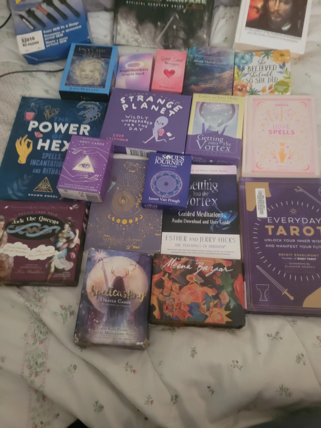 Selling a collection of various oracle and tarot card decks. Includes titles like 'Power Hex,' 'Strange Planet 2024 Calendar,' 'Angel Numbers Oracle Deck,' 'Everyday Tarot,' and more! Perfect for anyone interested in divination and spiritual guidance. Check out the photos for all the titles included