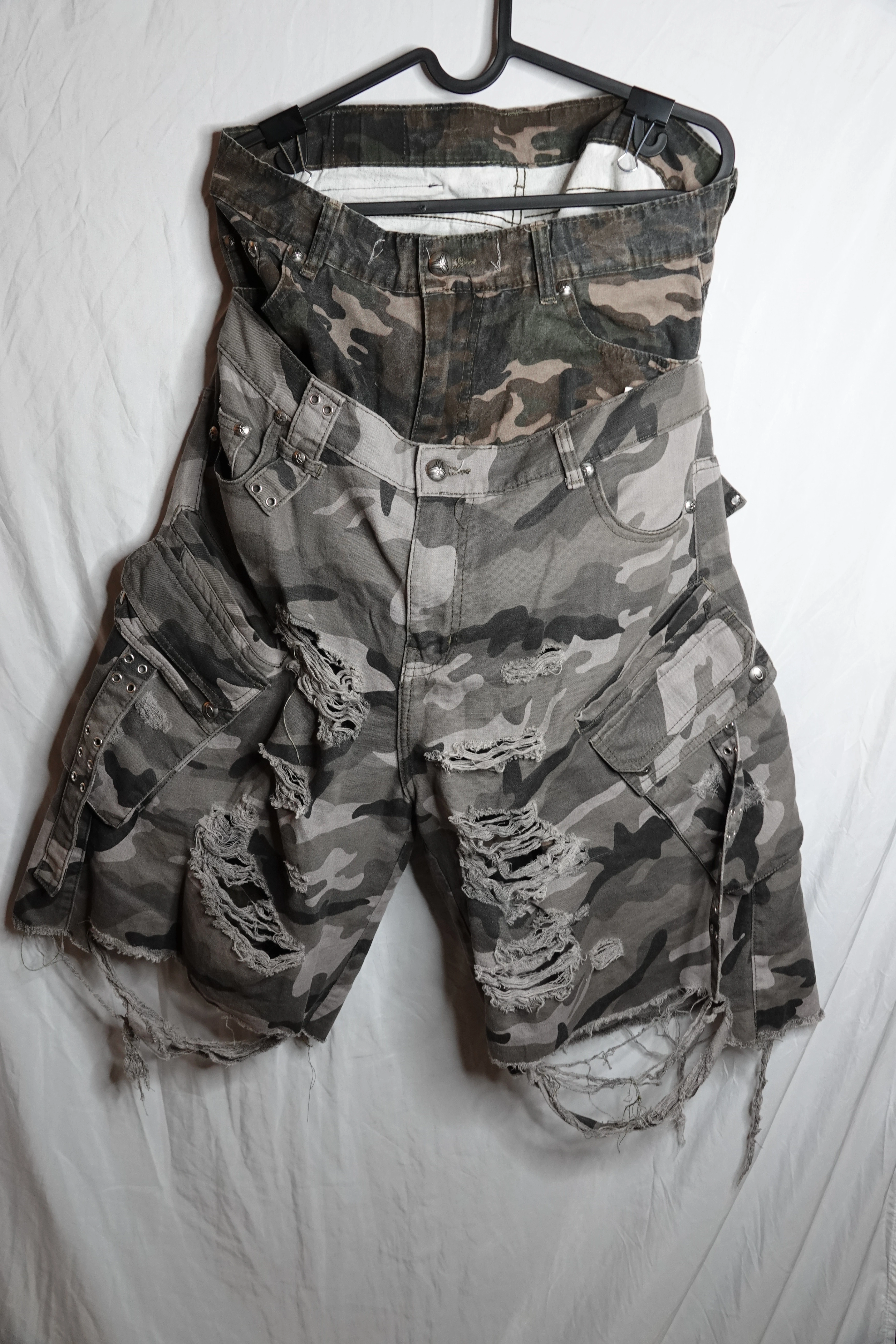 Rare Cozy Worldwide “005 Chaos Dream” Waxed Camo Jorts from FW24 release. Grunge/destroyed layered camo cargo jorts with extensive distressing, split waistband, utility pockets, and signature waxed finish. Highly sought-after for their avant-garde, “archival” streetwear silhouette. Unisex, extremely limited, sold out everywhere and hard to find secondhand. Condition: Used, heavy intended factory distressing, all hardware and details intact.