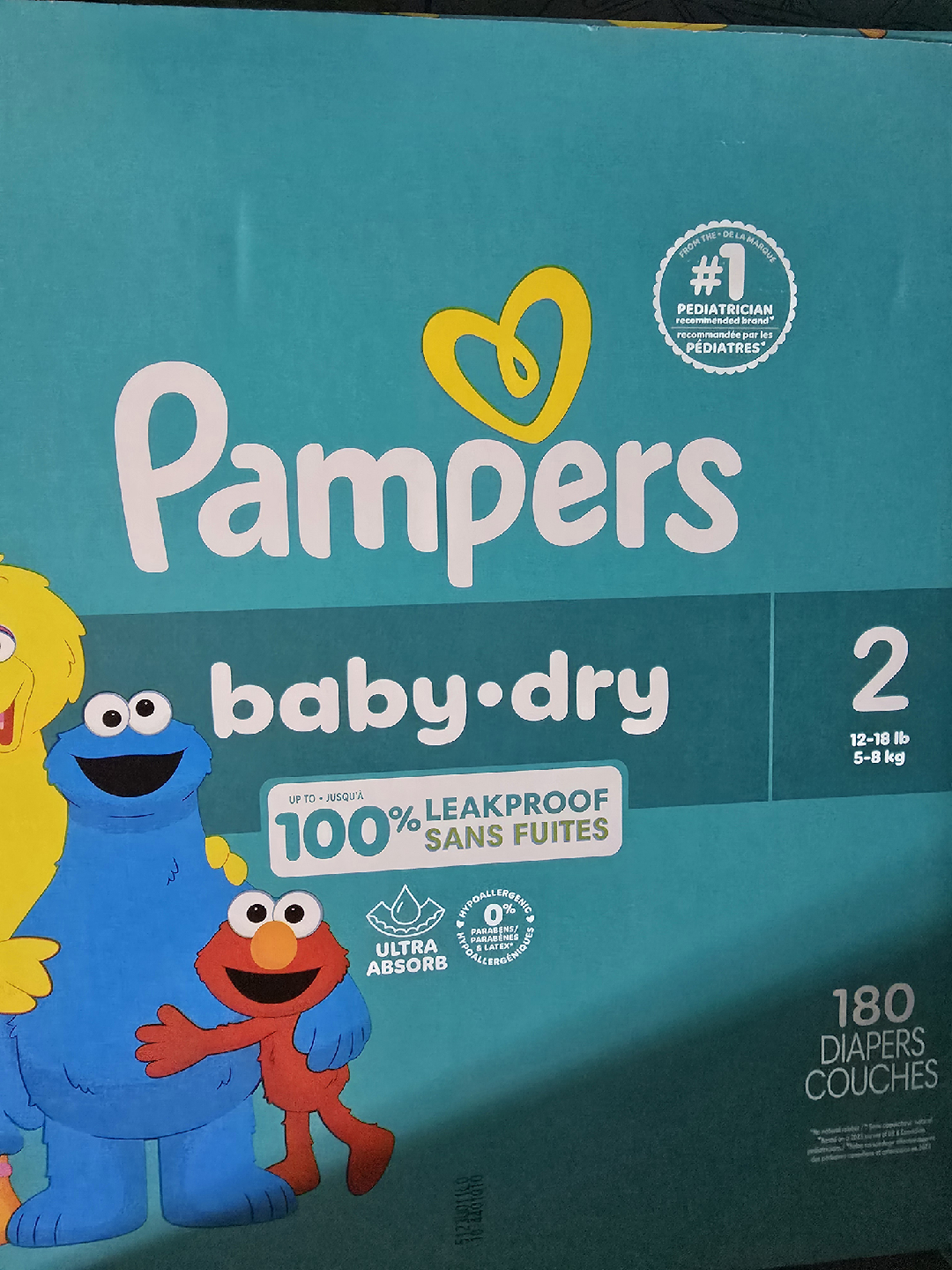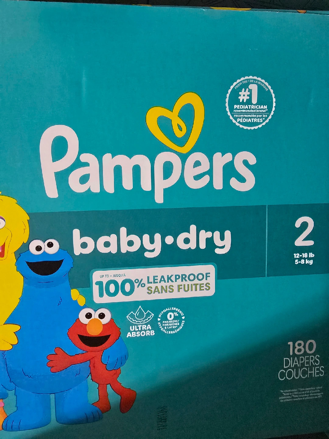 Selling a box of Pampers Baby Dry diapers, size 2 (for babies 12-18 lb or 5-8 kg). The box contains 180 diapers. They're designed to be 100% leakproof and ultra absorbent, so your little one stays comfy and dry!