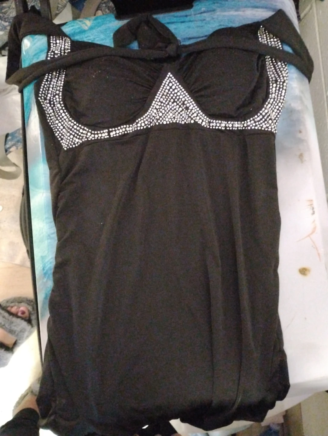 Here's a cute black top with rhinestone detailing around the bust and shoulders. It's in great condition and ready for a new home!