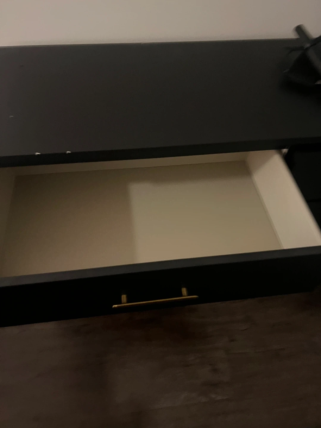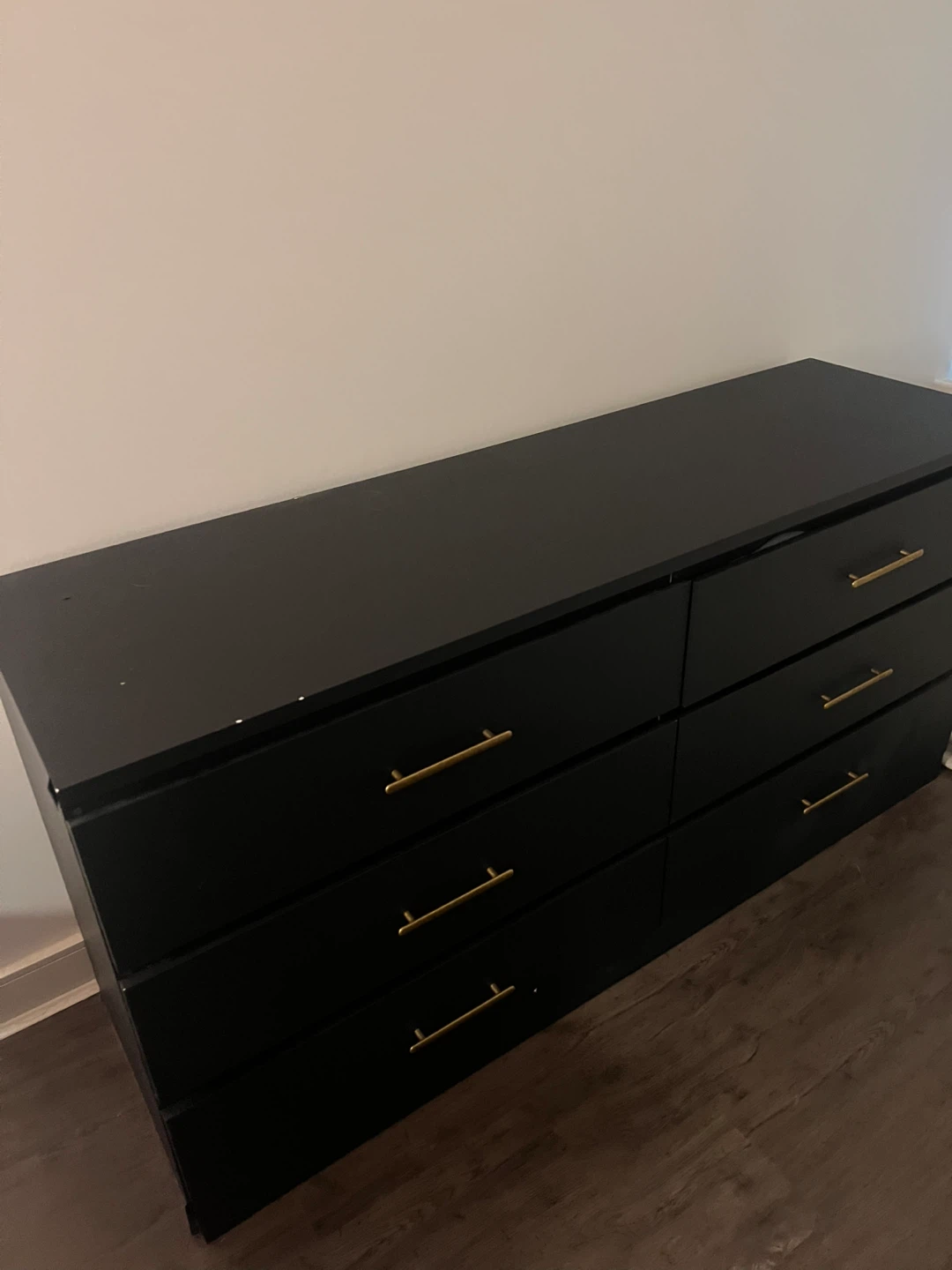 Free black dresser featuring stylish gold handles. It's a great piece to add a touch of elegance to any room! There are some minor signs of use. This has contact paper on it which can be removed with a hair dryer or redone. The side closest to the window isn’t finished.