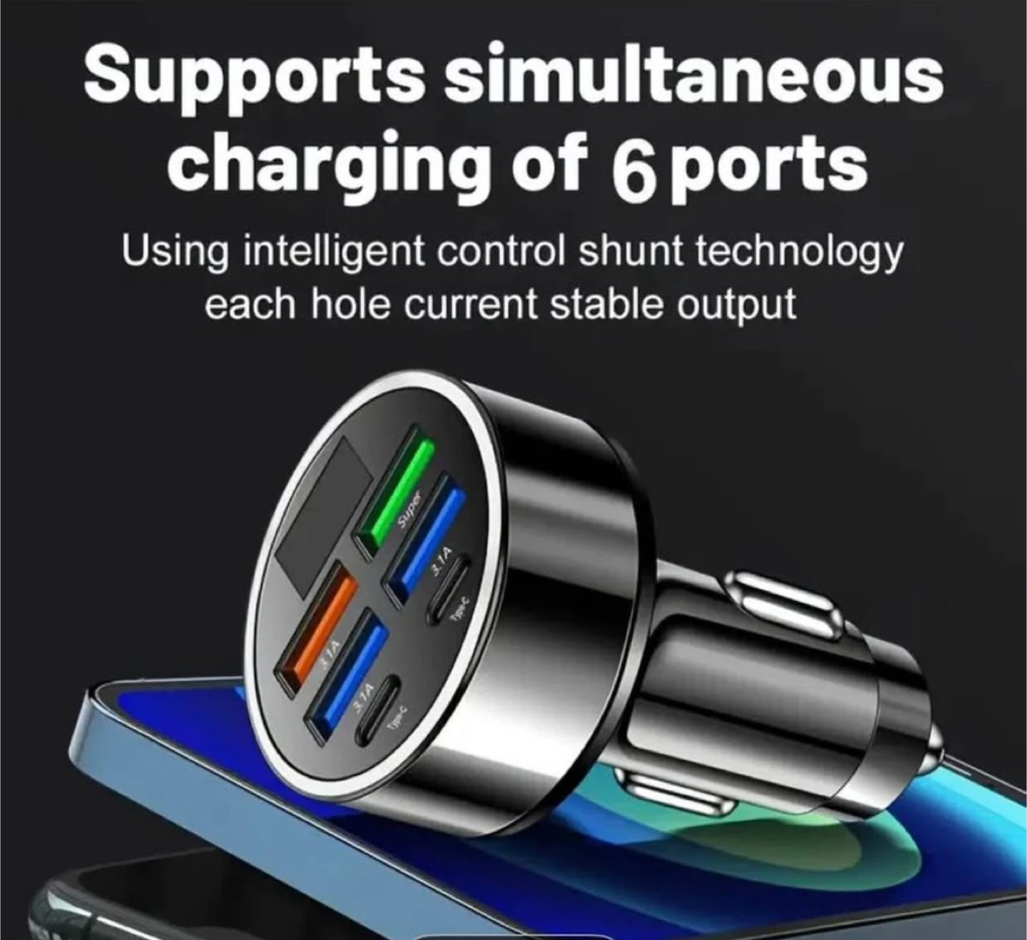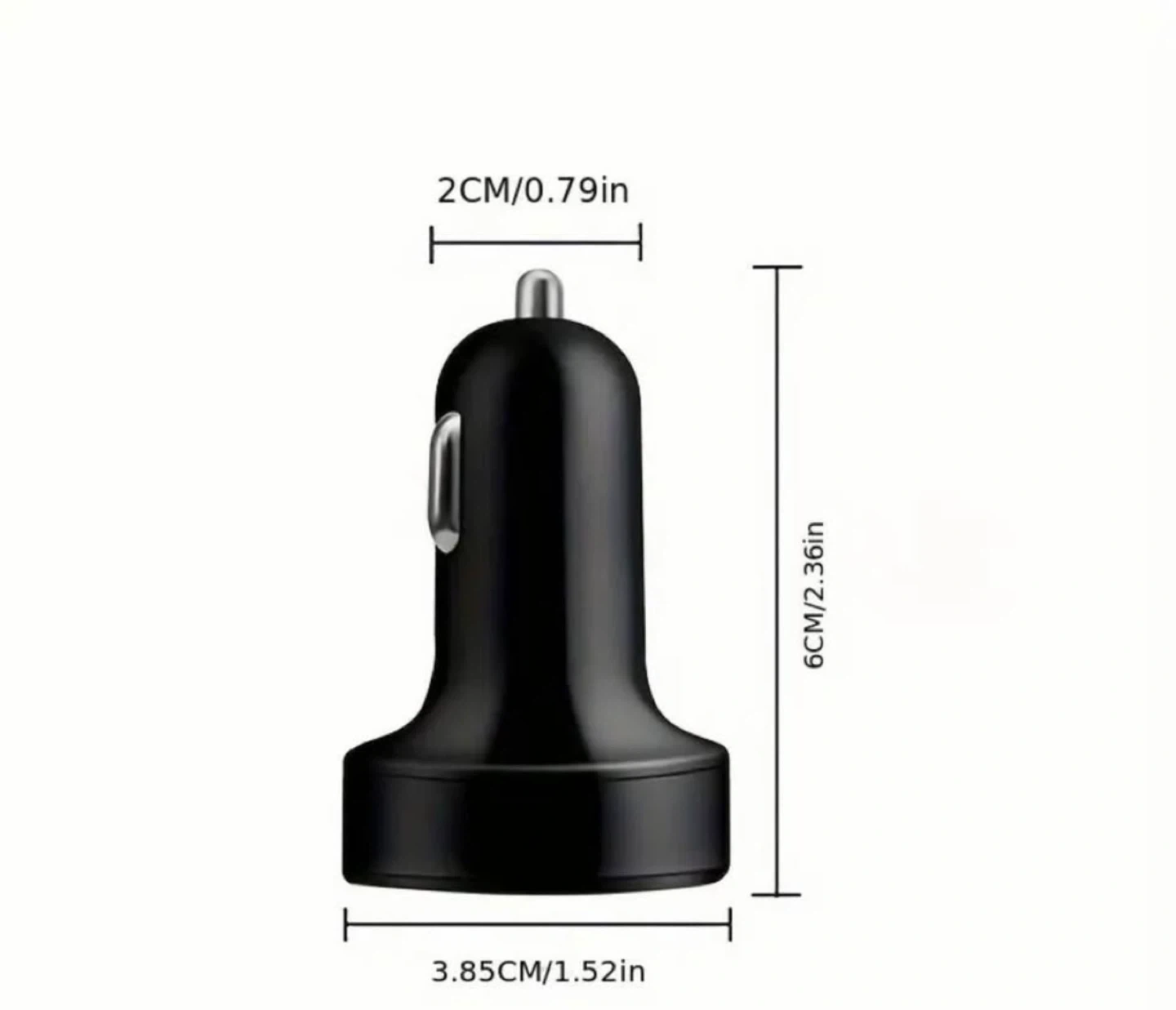 This car charger supports simultaneous charging of 6 ports using intelligent control shunt technology for stable output. It can charge to 60% in 30 minutes. Dimensions are 2cm/0.79in width and 6cm/2.36in height.