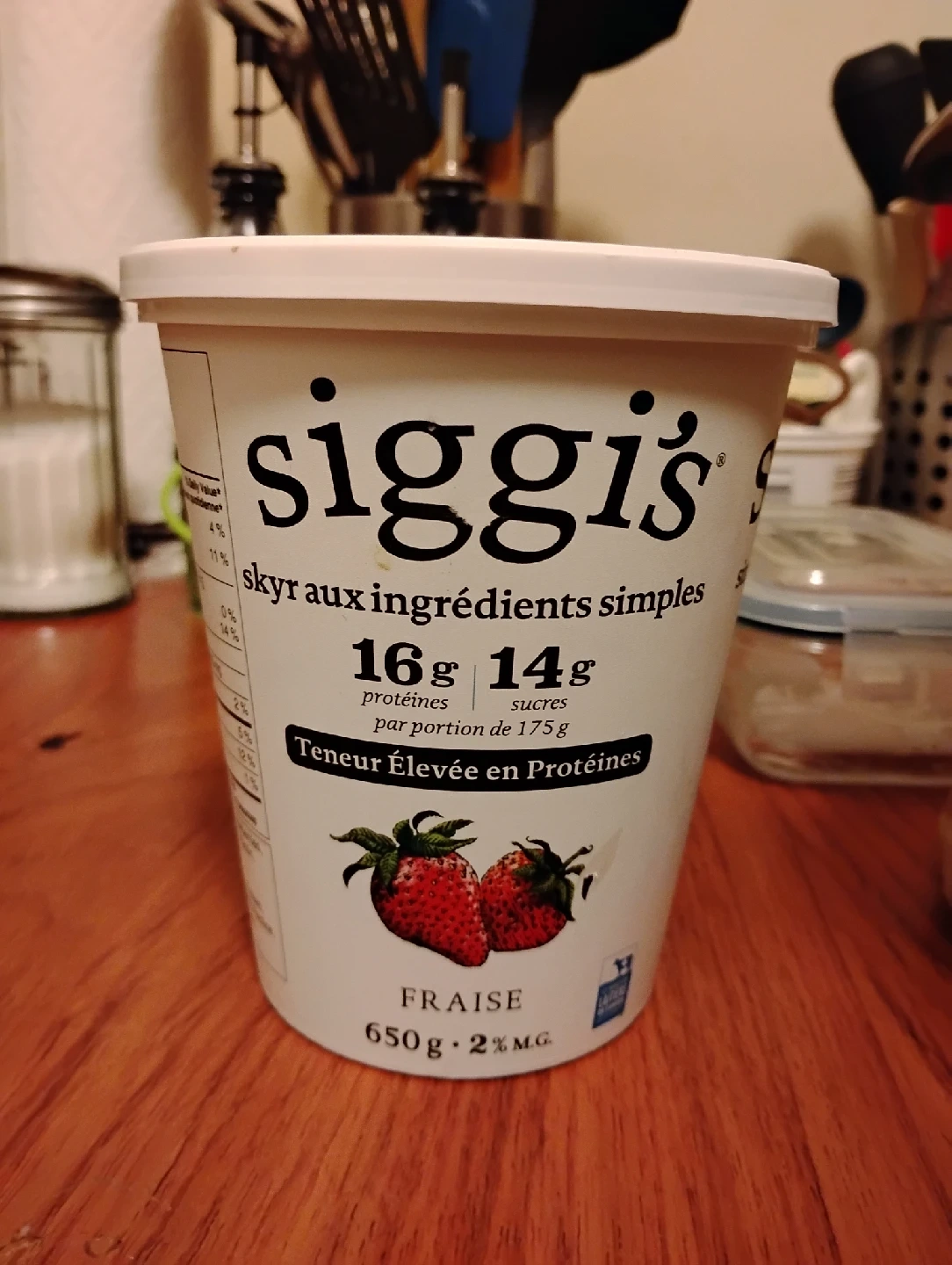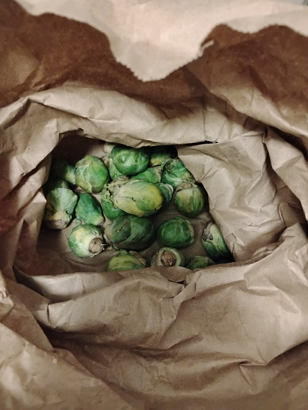 A TUB OF STRAWBERRY YOGURT, A BAG OF BRUSSELS SPROUTS, THREE APPLES, PACKETS OF SALT AND CRACKED BLACK PEPPER AND PACKETS OF DRIED VEGGIES FROM INSTANT NOODLES. CAT HOME.