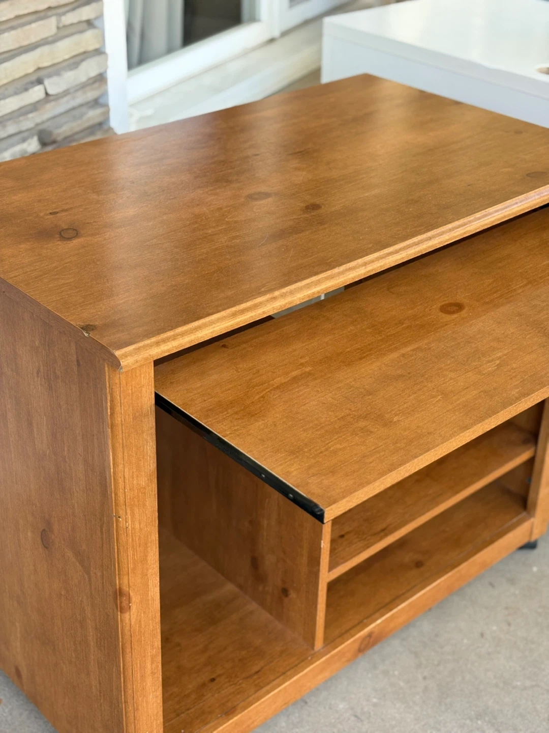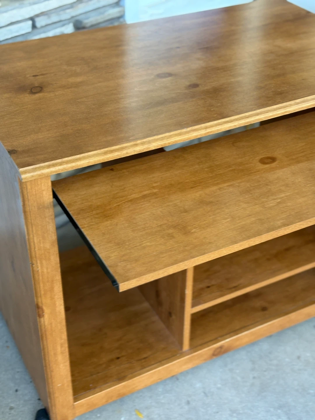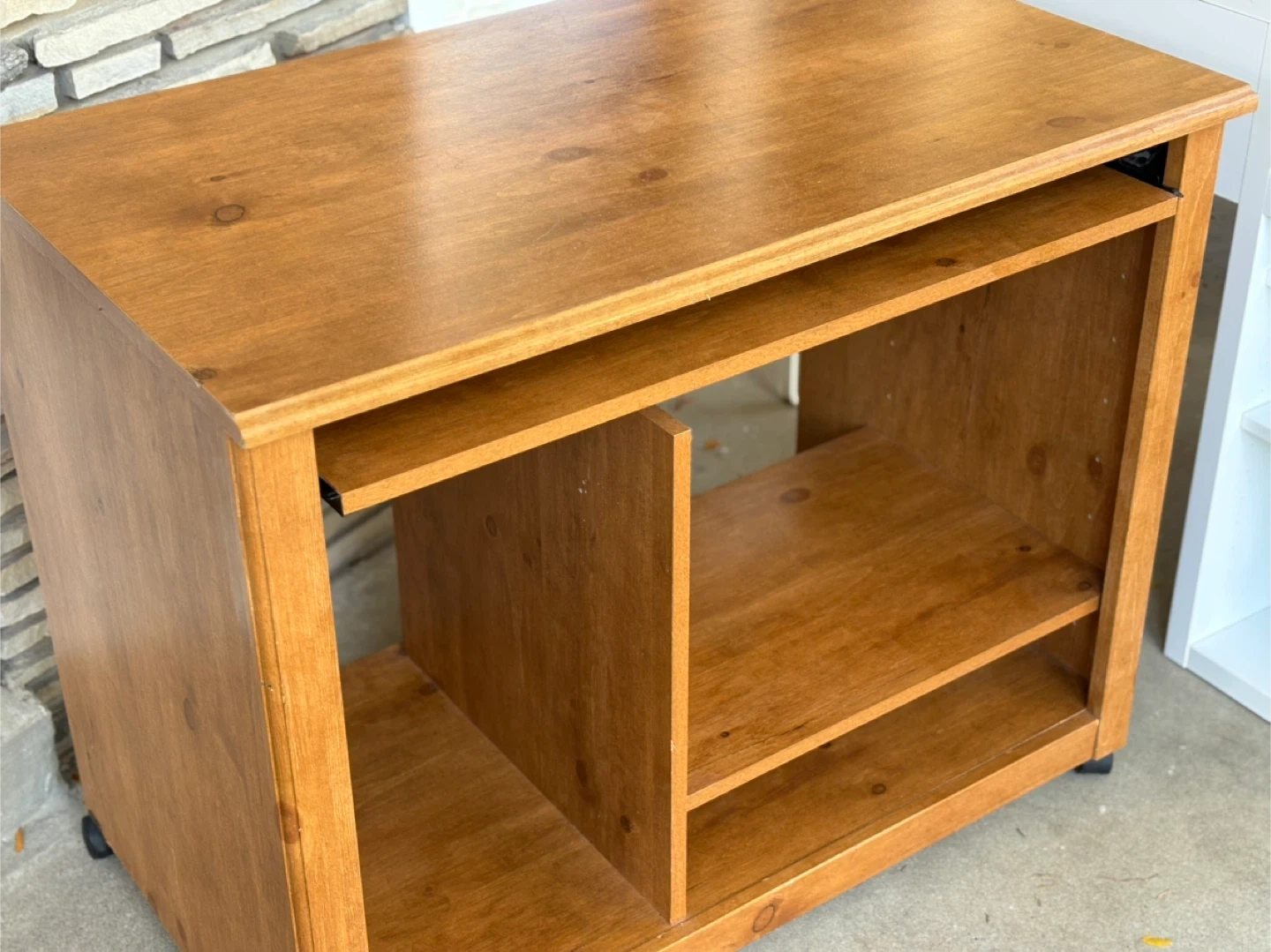 Selling a wooden computer desk in good condition. It features a convenient pull-out keyboard tray and some shelving space for storage. It's a great piece for a home office or study area!