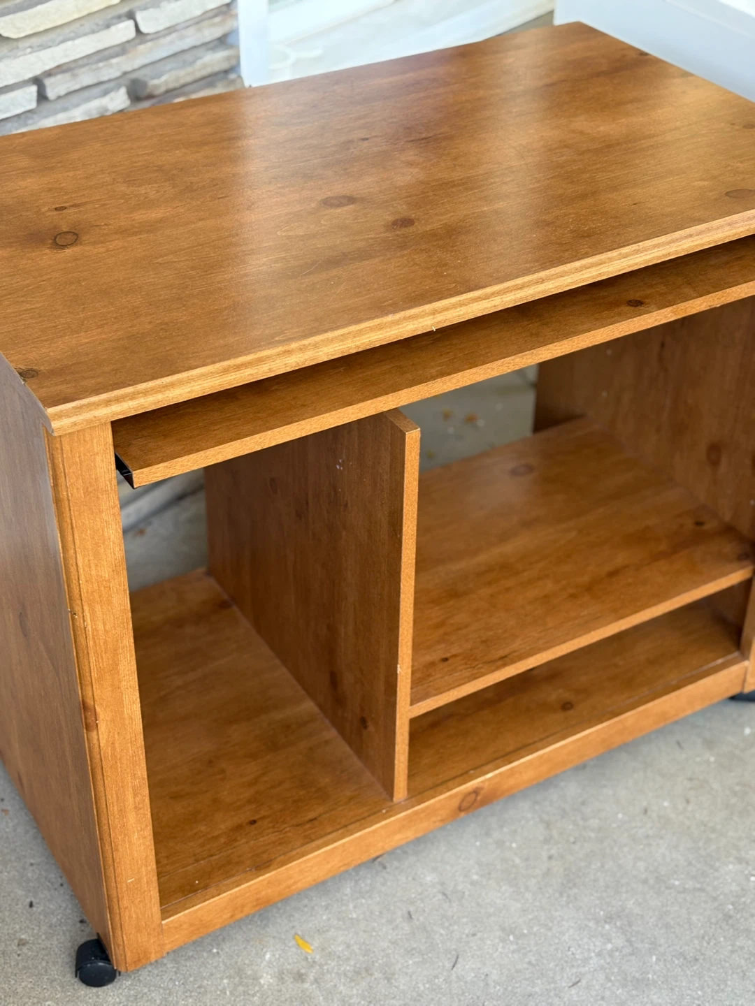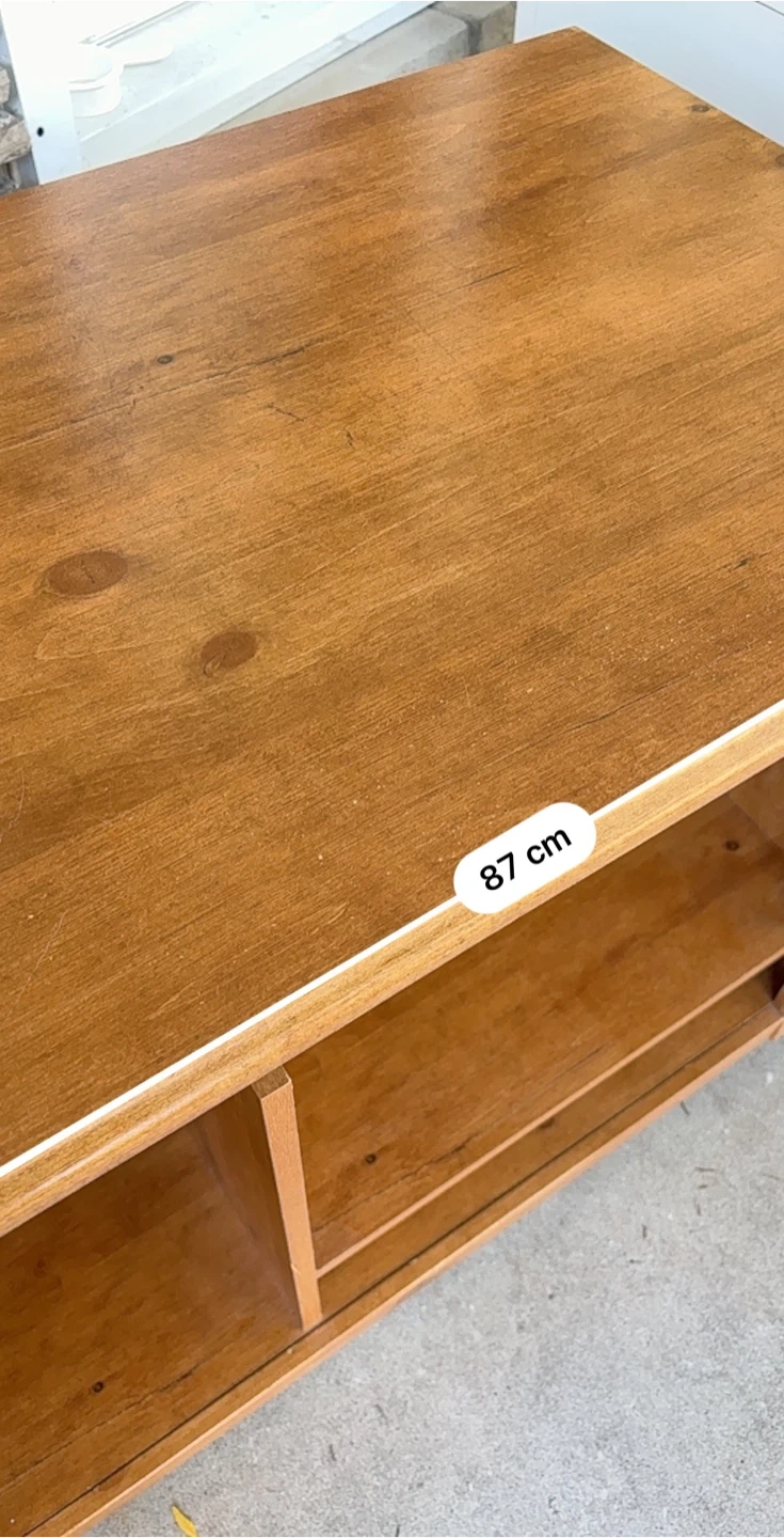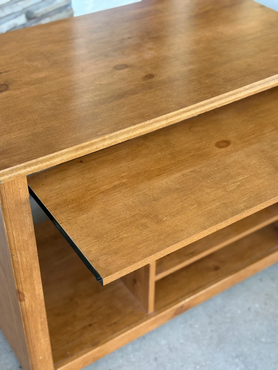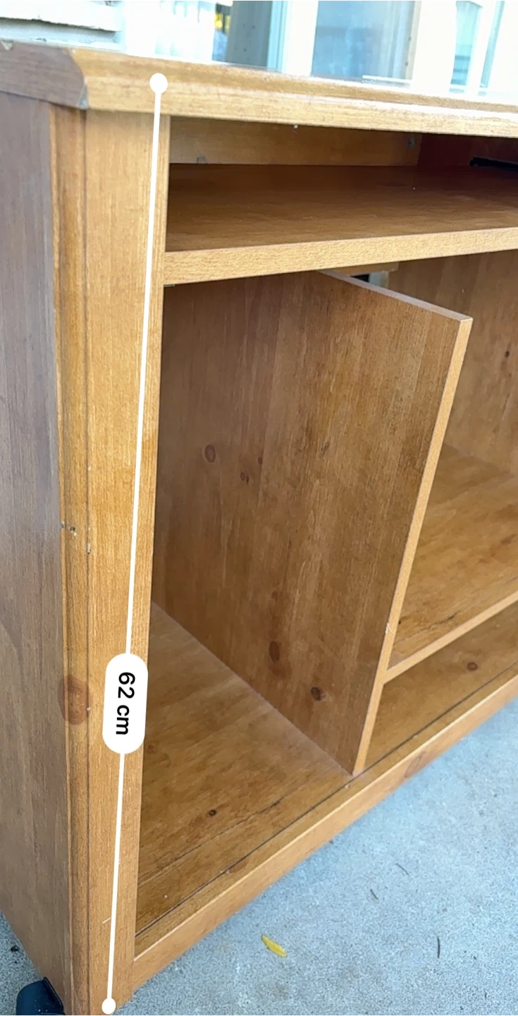 Selling a wooden computer desk in good condition. It features a convenient pull-out keyboard tray and some shelving space for storage. It's a great piece for a home office or study area!
