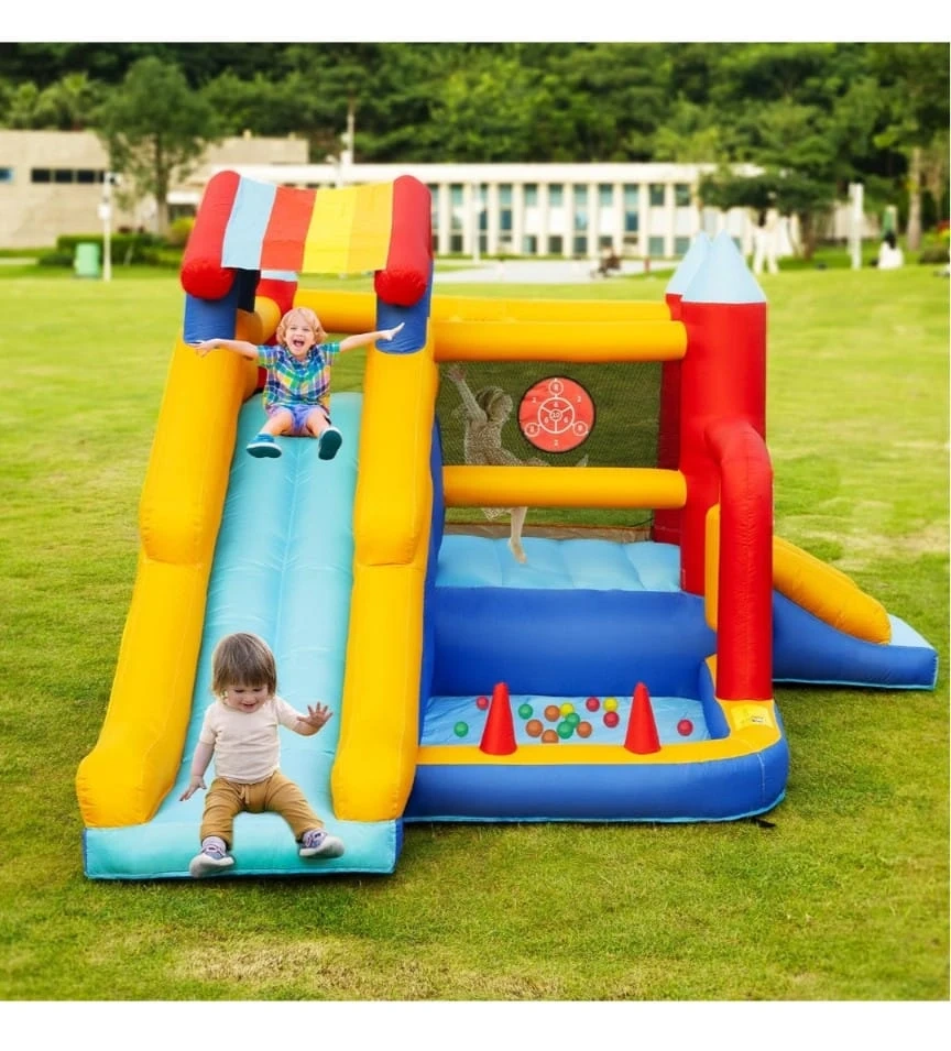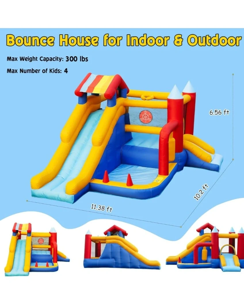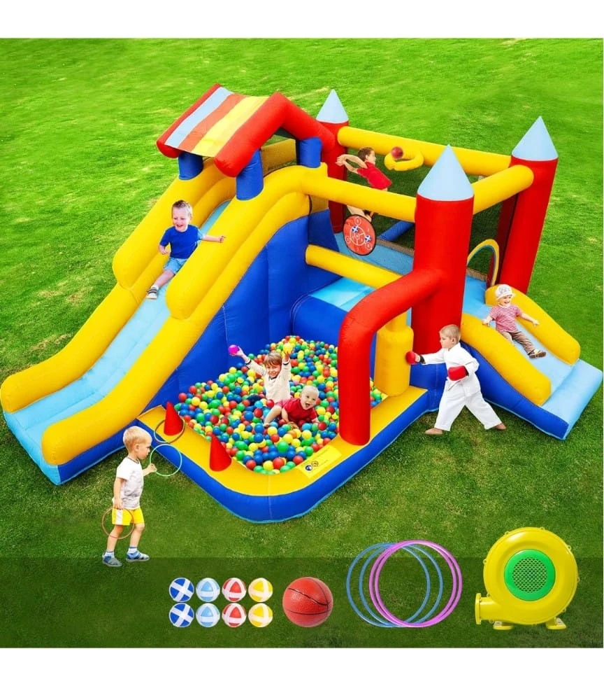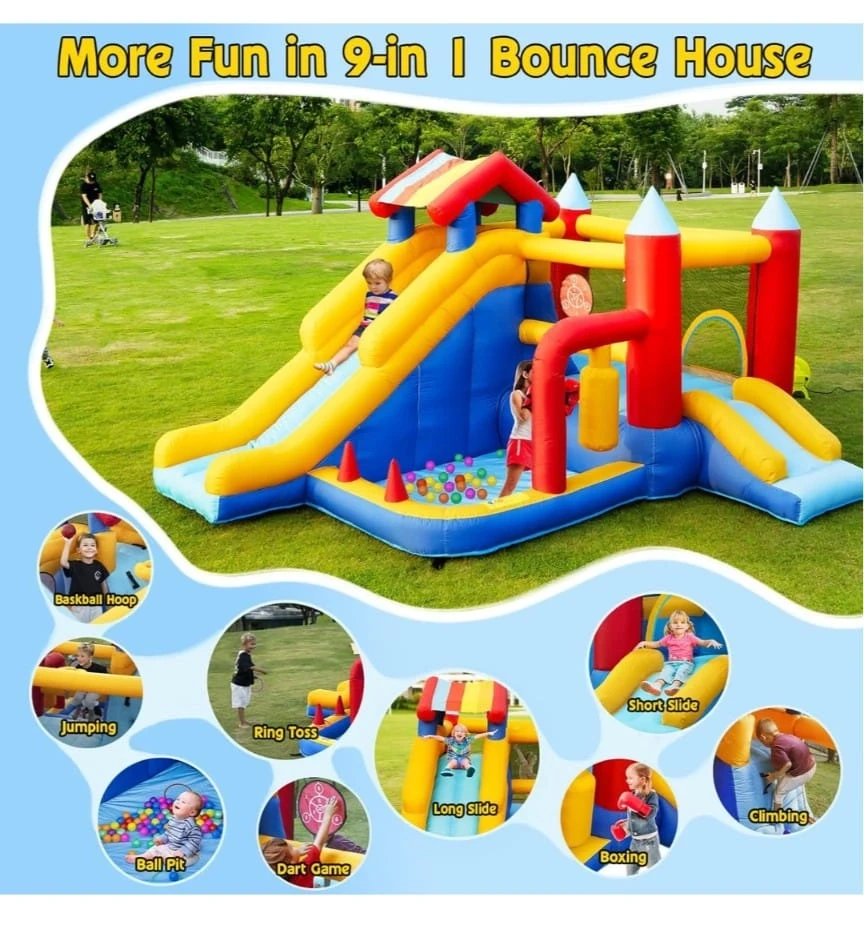 This 9-in-1 bouncy castle has a spacious Jumping castle with slide, dart, boxing, basketball hook, provide ample space for multiple to jump, bounce, and slide simultaneously, promoting active play and exercise, suitable for indoor and outdoor use.