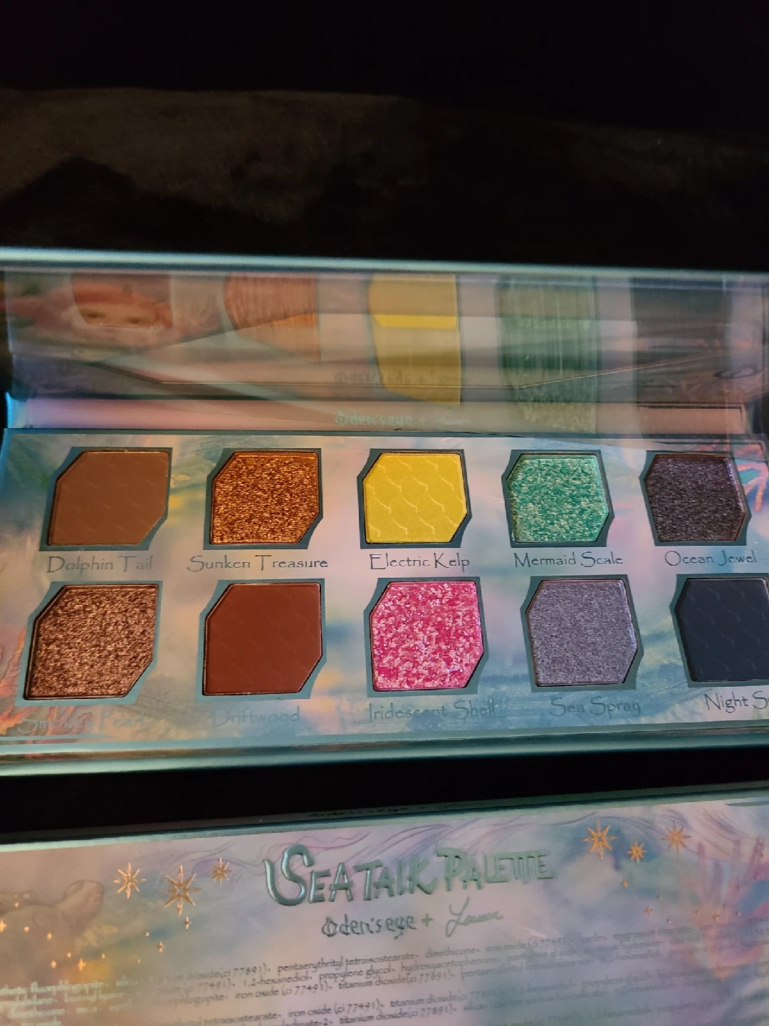 175Oden's Eye Sea Talk Palette. The palette features a range of shades including Dolphin Tail, Sunken Treasure, Electric Kelp, Mermaid Scale, and Ocean Jewel. Perfect for creating a variety of eye looks!