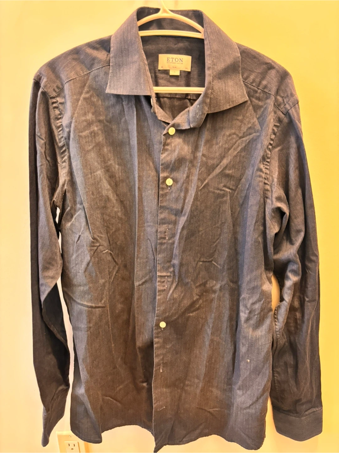 Selling an Eton dress shirt in size 16 1/2. It's a slim fit and marked as a size L. This shirt is perfect for any occasion where you want to look sharp!