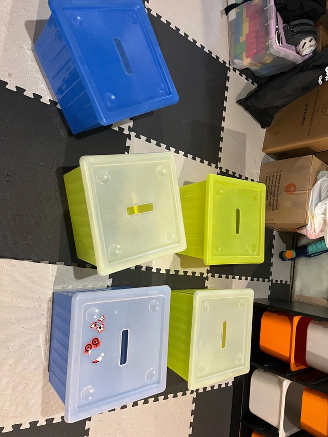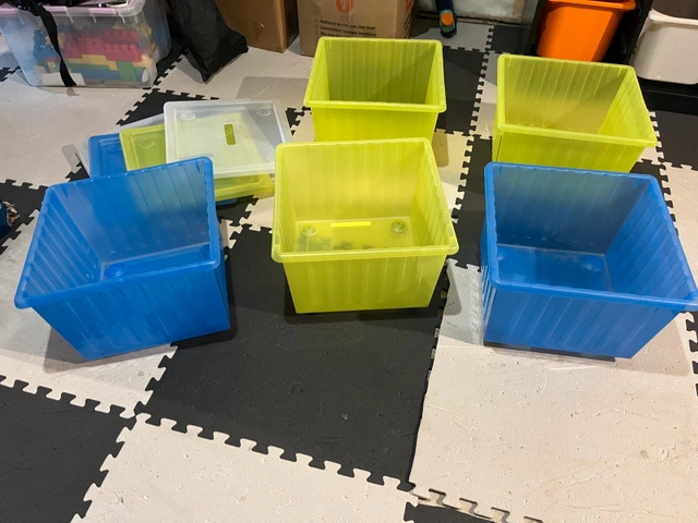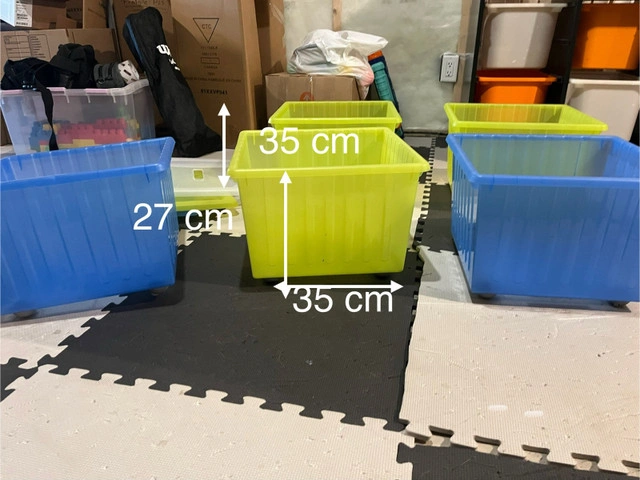 12I'm selling a set of used storage bins, perfect for organizing toys or other household items! These bins are in good condition and ready to help you declutter. The dimensions are 35cm x 35cm x 27cm. * Durable plastic * Stackable design Similar bins are listed on Kijiji for around $10-$20 each. I'm asking $15 per bin, a fair price for their condition and utility. If you're seeing this ad, the bins are still available! Cash Only