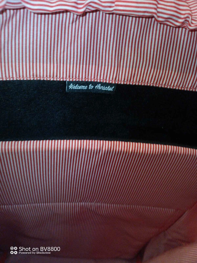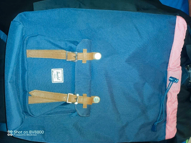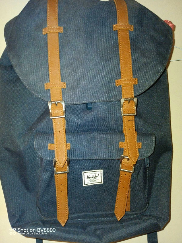 25Check out this great Herschel backpack, perfect for school, travel, or everyday use! This backpack has a denim look exterior with brown leather straps and the signature Herschel red and white striped lining. Features: * Denim-look exterior * Brown leather straps * Red and white striped lining * Spacious main compartment * Front pocket with key clip The Kijiji median sale price is approximately $50 CAD, so I've priced it accordingly. If the ad's still up, it's still available, so no need to ask! Get ready to make this backpack your trusty companion for all your adventures!