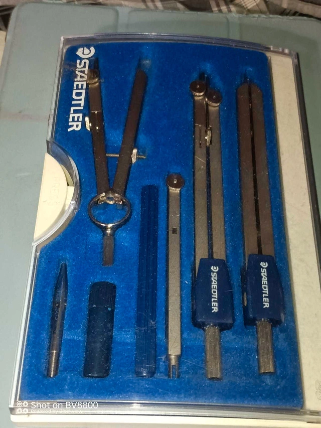 This Staedtler compass set is perfect for precise drafting and drawing. The set includes a compass, dividers, spare leads, and attachments, all housed in a sturdy blue case. The tools are in used condition, ready for your next project. High-quality construction. Complete set for various drawing needs. Durable storage case. This compass set is ready to go!