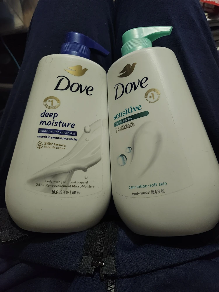 Selling two bottles of Dove body wash! One is Deep Moisture, which nourishes the driest skin with 24hr Renewing MicroMoisture. The other is Sensitive, a hypoallergenic formula with 24hr lotion-soft skin benefits. Both bottles contain 30.6 fl oz