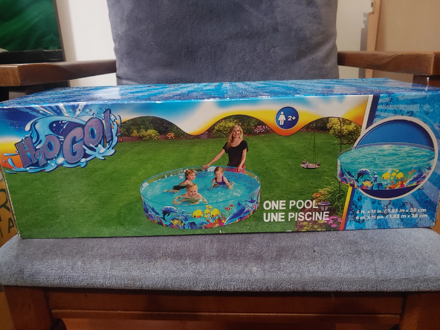 Brand new H2OGO! Fill 'N Fun Odyssey Pool in its original box! This pool is perfect for some summer fun. It's 6 ft x 15 in / 1.83 m x 38 cm and holds 946 L (250 gal) of water. Recommended for ages 2+
