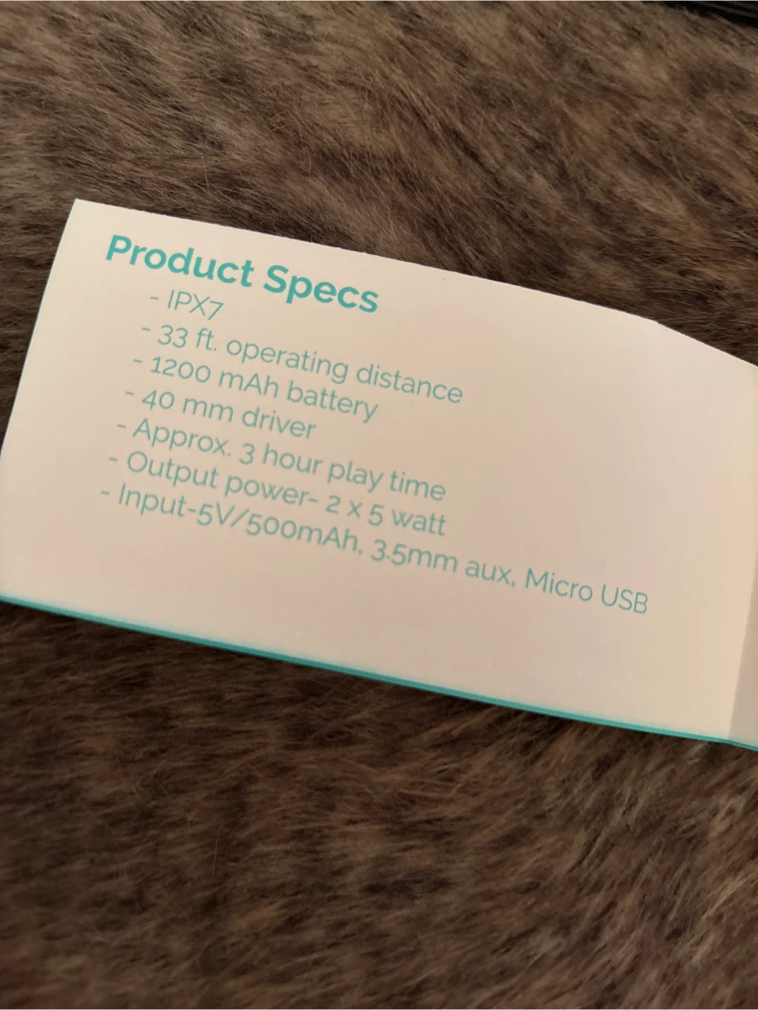 - Input-5V/500mA, 3.5mm aux, Micro USB