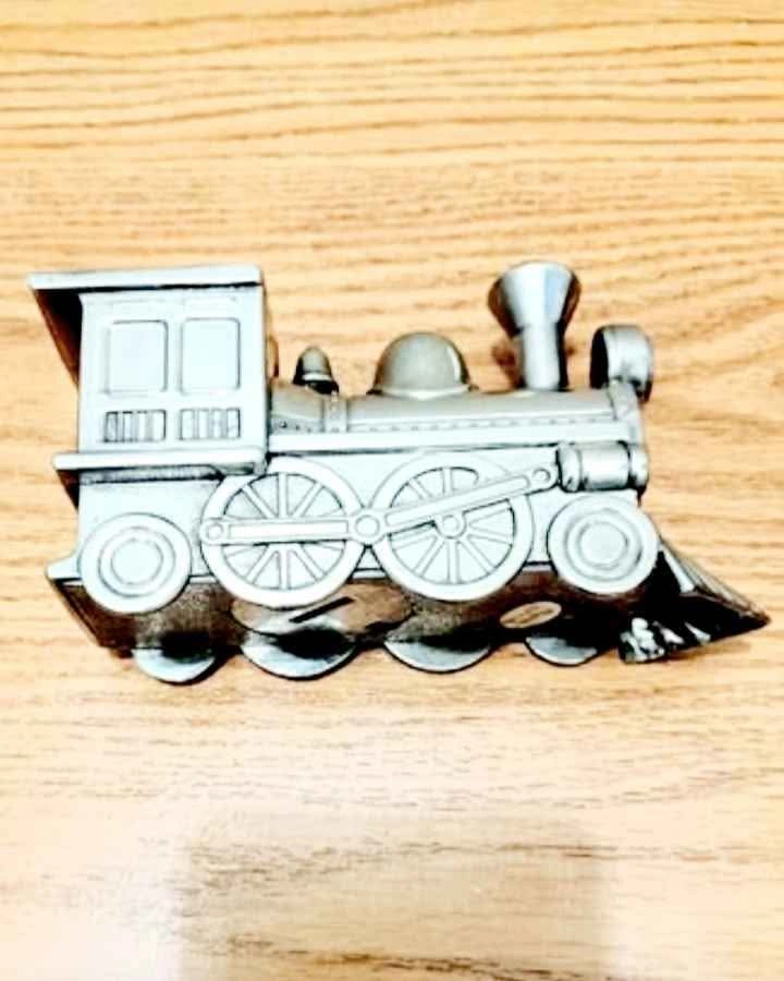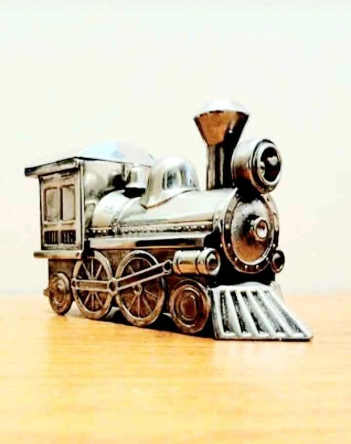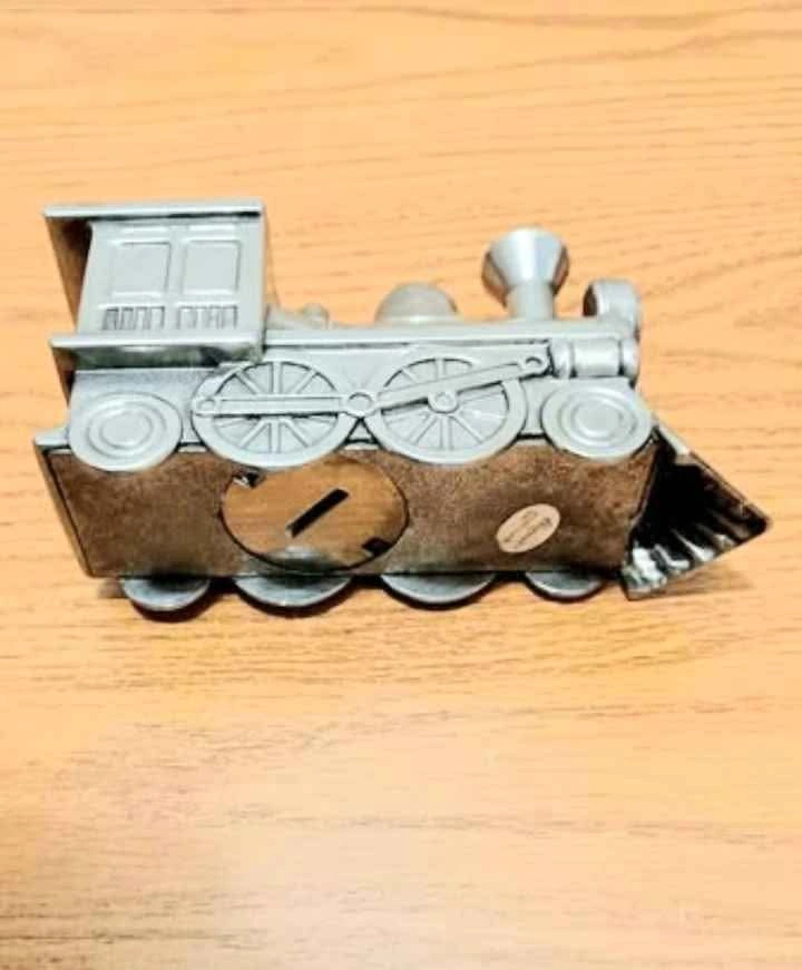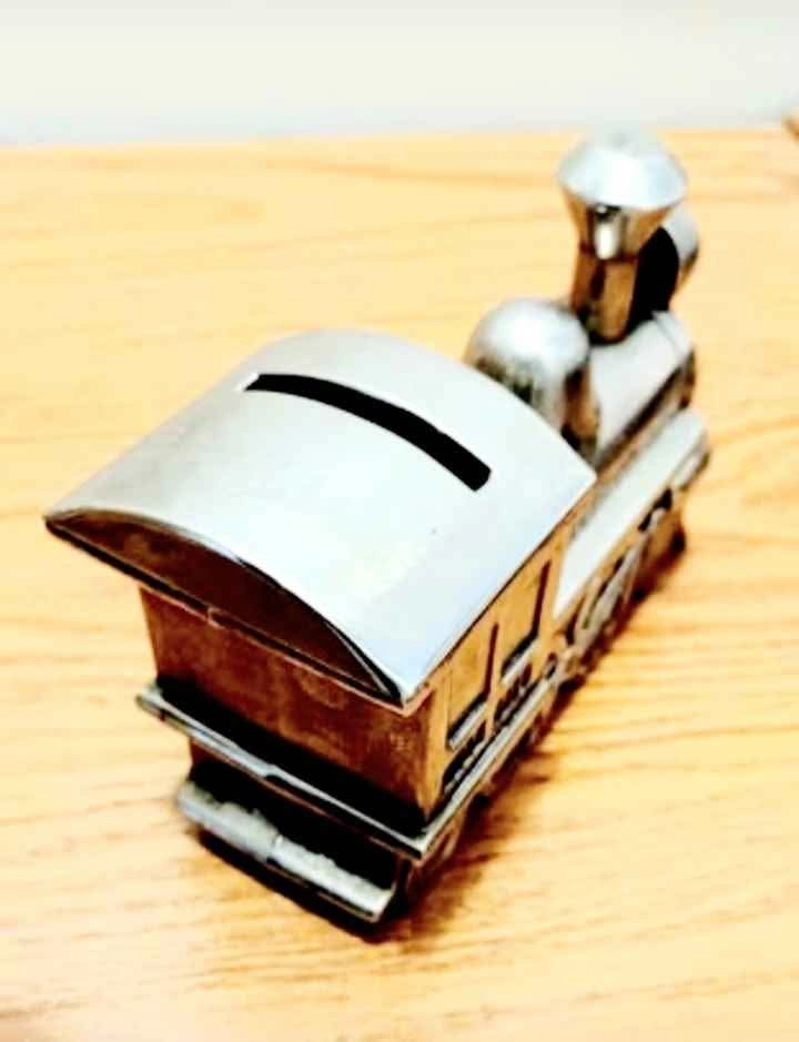 65Vintage, collectible, tarnish-resistant silver-plated zinc train piggy bank decorative figurine, designed in the shape of an antique steam train locomotive. Length: 6 inches, Height: 3 inches, Width: 2 inches. Very good condition, with sticker. Please check out my other rare collectibles!