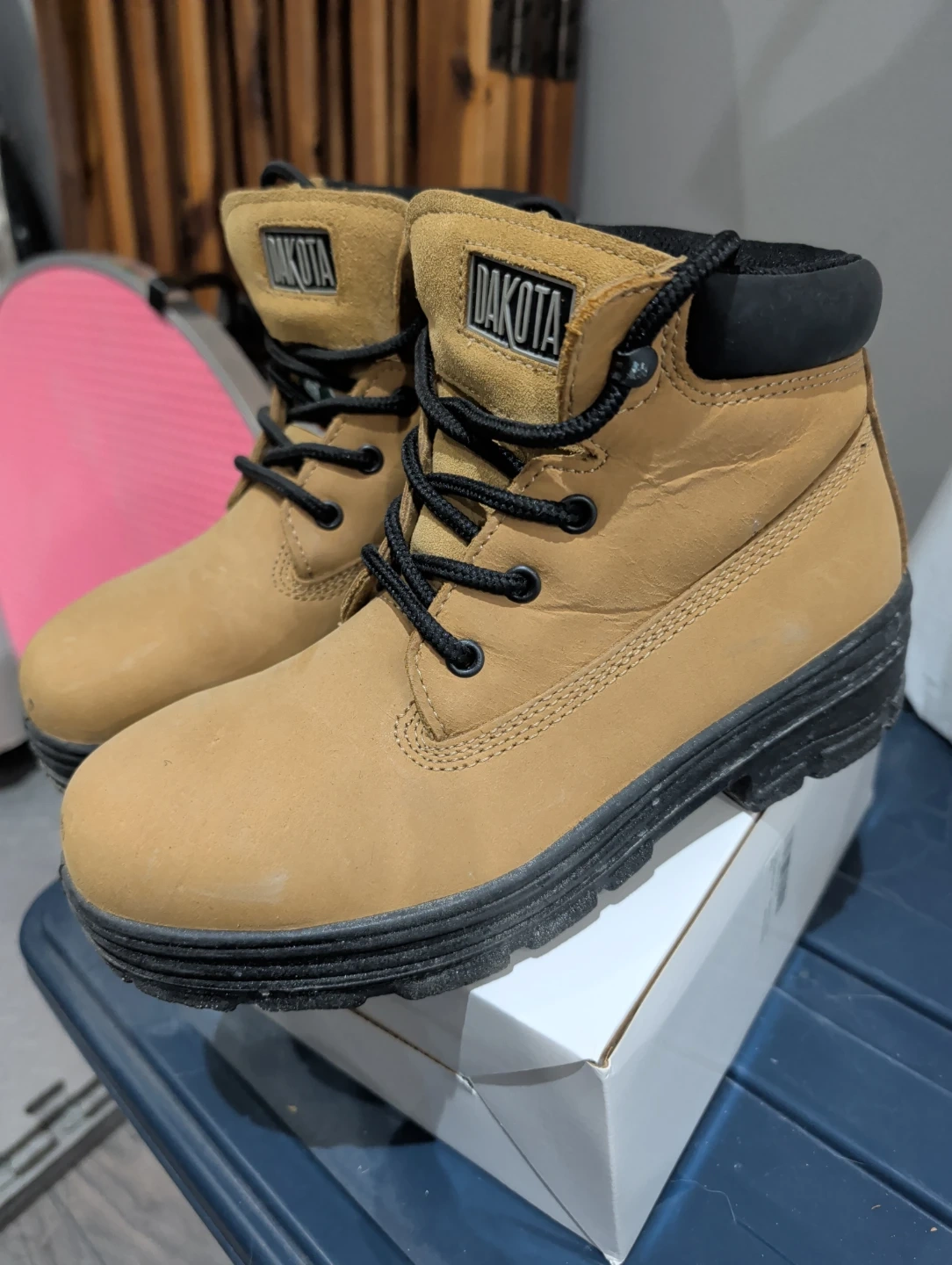 10Dakota work boots in good condition! These sturdy boots are perfect for any job site or outdoor activity. They are a tan colour with black laces and soles. Ready to keep your feet safe and comfortable! Worn them once and haven't used them since.
