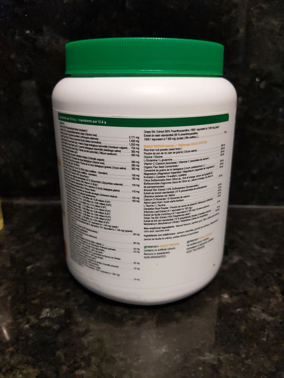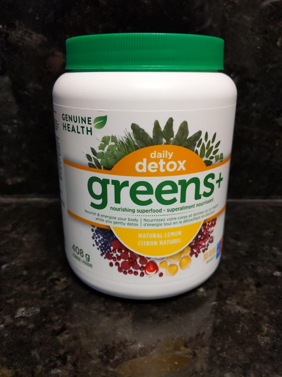 Selling a container of Genuine Health Daily Detox Greens+ in Natural Lemon flavour. This nourishing superfood helps nourish and energize your body while you gently detox. The container has 408g of powder.