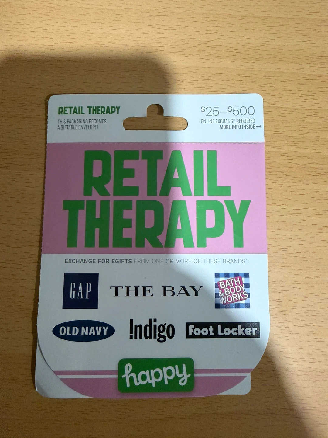 Selling a Retail Therapy gift card that can be used at various stores like Gap, The Bay, Old Navy, Indigo, and Foot Locker. It's a great gift option!