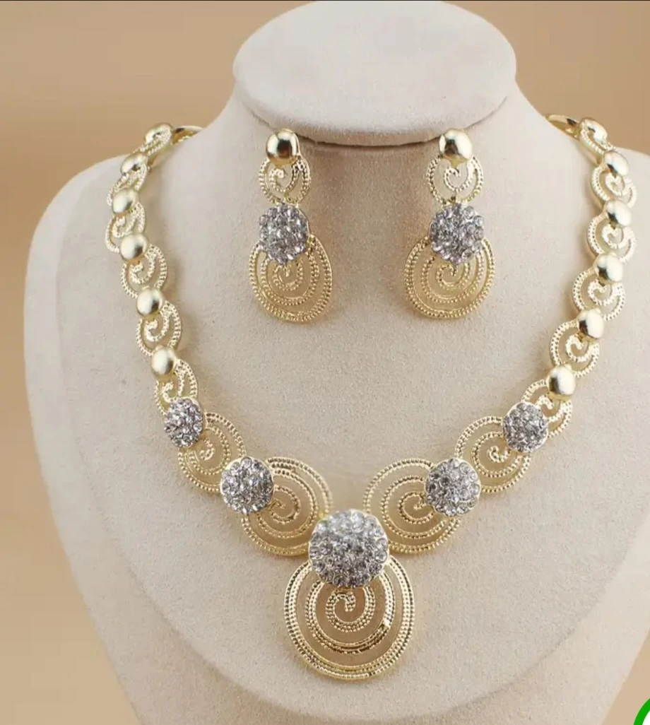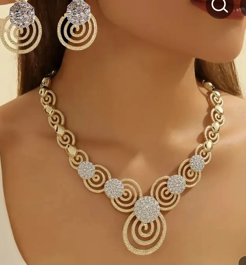 Selling a lovely Gold Plated necklace and earring set. The necklace is approximately 38 + 7 cm (14.96 + 2.76 inches) in length. The earrings are about 4 cm (1.57 inches) long and 2 cm (0.79 inches) wide. Perfect for adding a touch of sparkle to any outfit! Great for the coming holidays