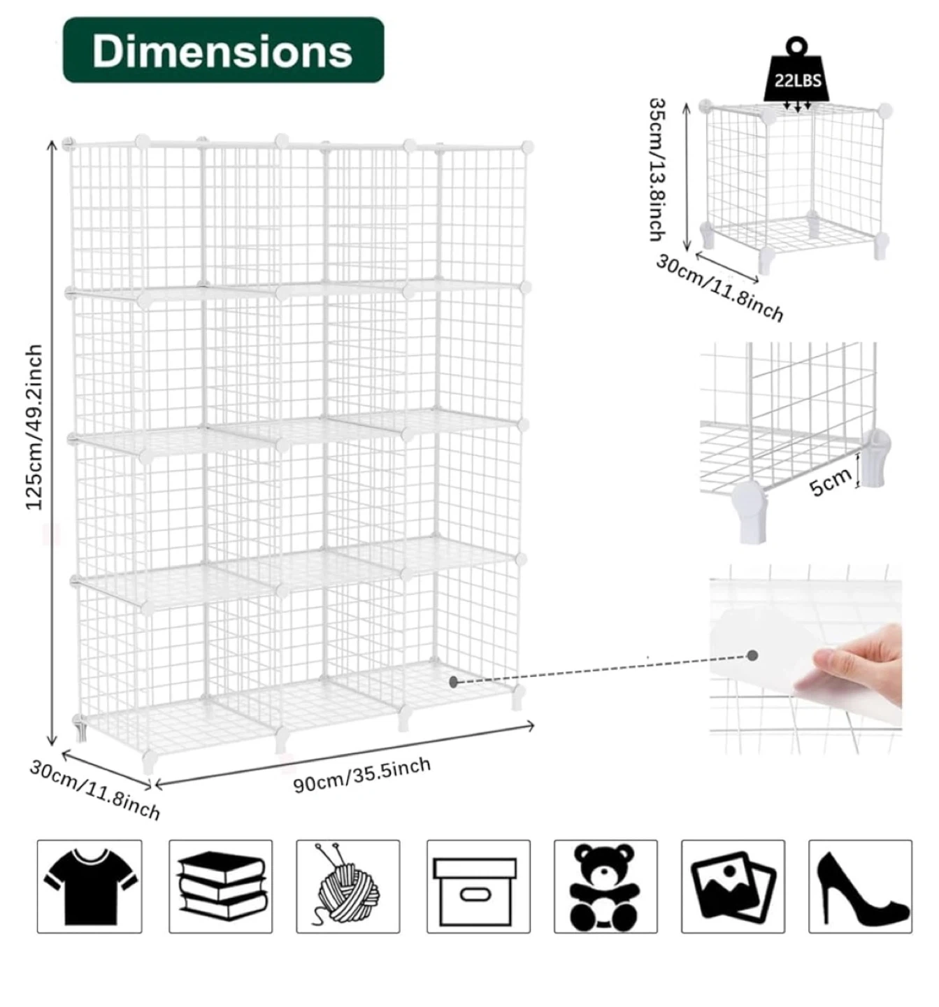 177Declutter your space with this modular wire cube storage shelf! It's perfect for organizing clothes, books, or anything you need to store. The dimensions are: - 125cm/49.2inch tall - 90cm/35.5inch wide - 30cm/11.8inch deep Each cube is 35cm/13.8inch tall and 30cm/11.8inch wide