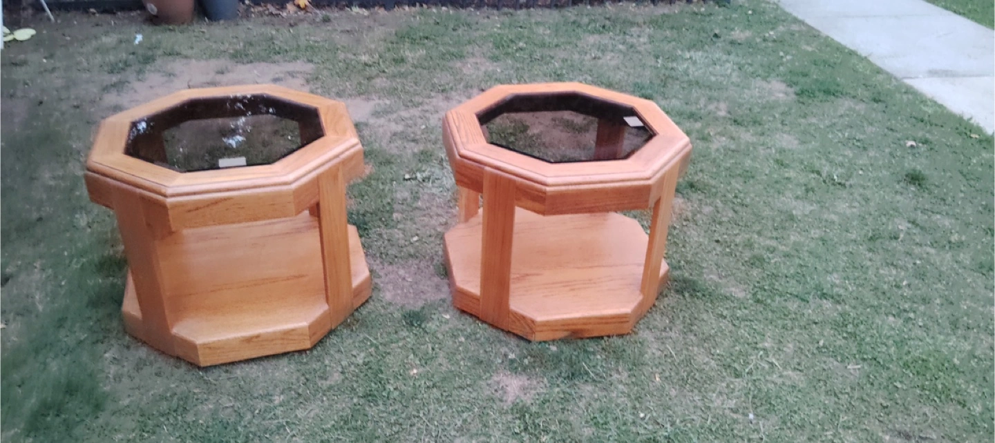 Selling a set of two octagon-shaped end tables! They appear to be made of wood and have a glass top. They're in good condition and would look great in any living room