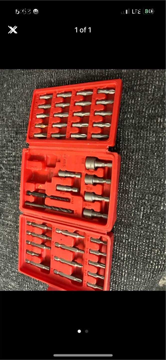 Here's a drill bit set in a red case. It includes a variety of drill bits and drivers, perfect for any DIY project or repair around the house! The bits are neatly organized in the case, making it easy to find the right size you need