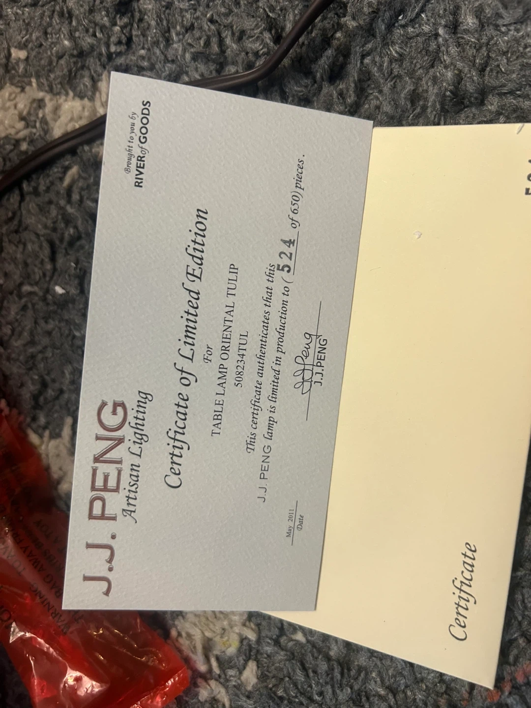 Selling a J.J. Peng Artisan Lighting table lamp, Oriental Tulip model 508234TUL. It's a limited edition piece, number 524 of 650. This beautiful lamp would make a great addition to any room!