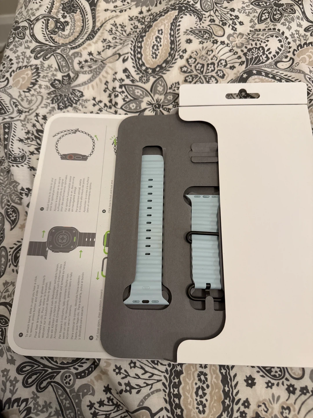 Selling a brand new Apple Watch 49mm Ocean Band in blue. It's compatible with Apple Watch Ultra models, working with 44mm, 45mm, and 49mm cases. This band is designed for wrist sizes from 130–200 mm. Comes with the original packaging and instructions