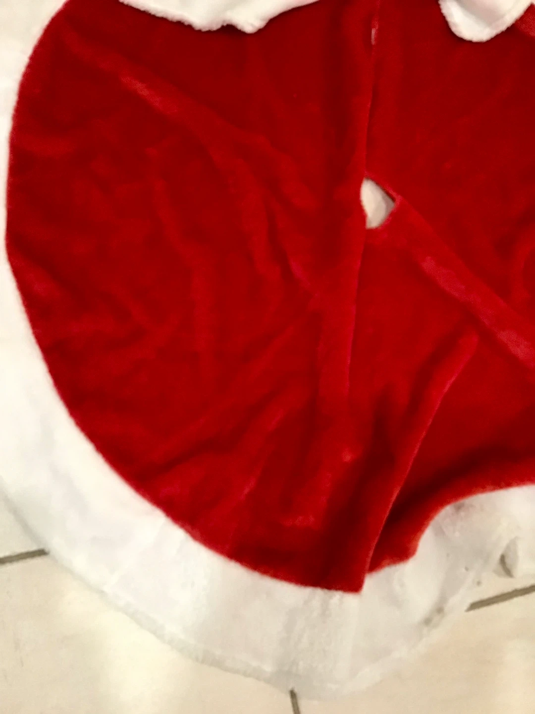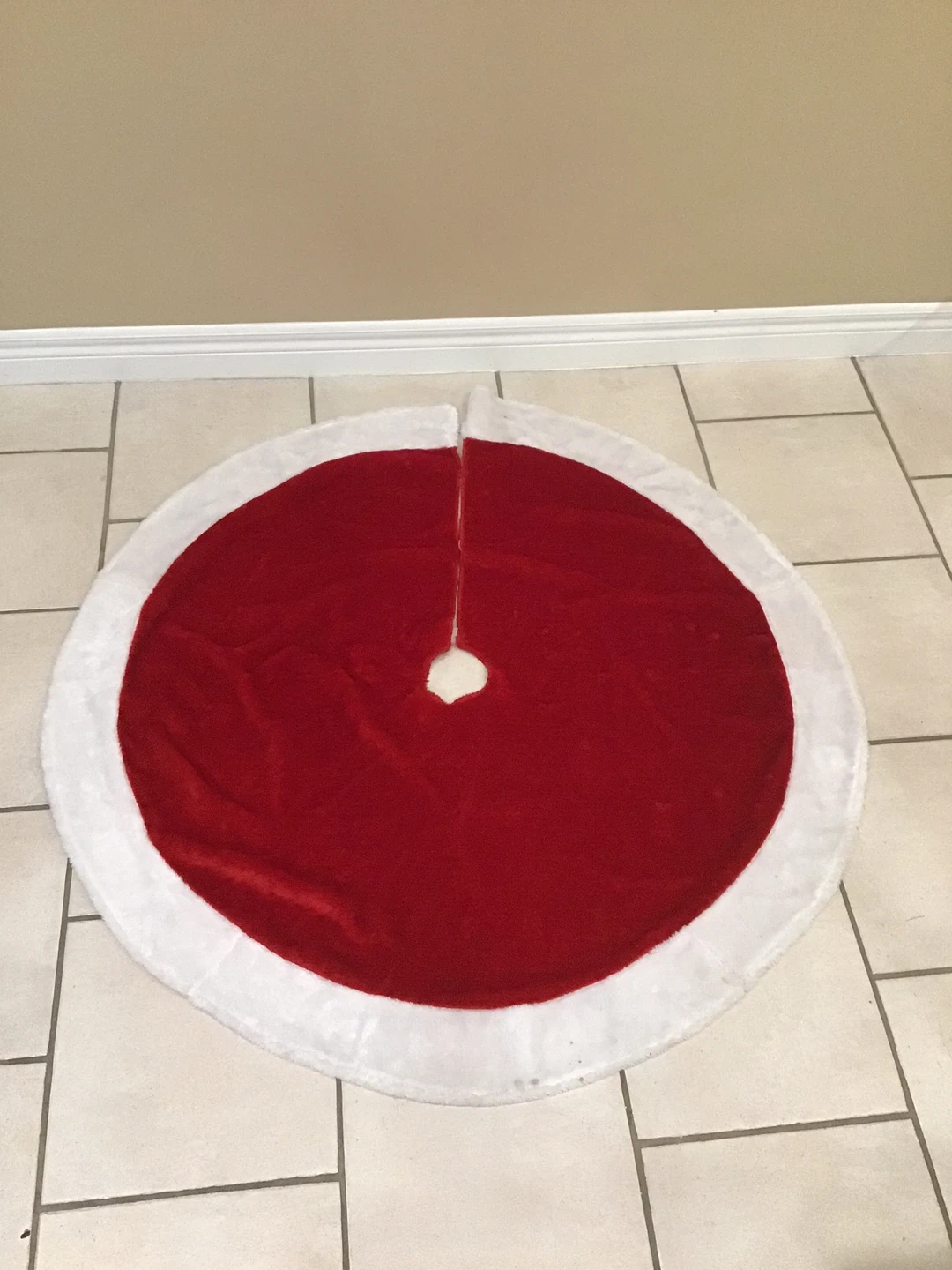 Selling a festive red and white Christmas tree skirt! It's perfect for adding a touch of holiday cheer to your living room.