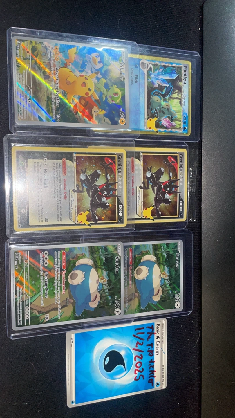 Selling a collection of Pokémon cards! Includes Pikachu, Mimikyu, Greninja, and Snorlax cards. The cards are in great condition and ready for a new collector. The Basic Energy card has the date 11/2/2025 written on it.