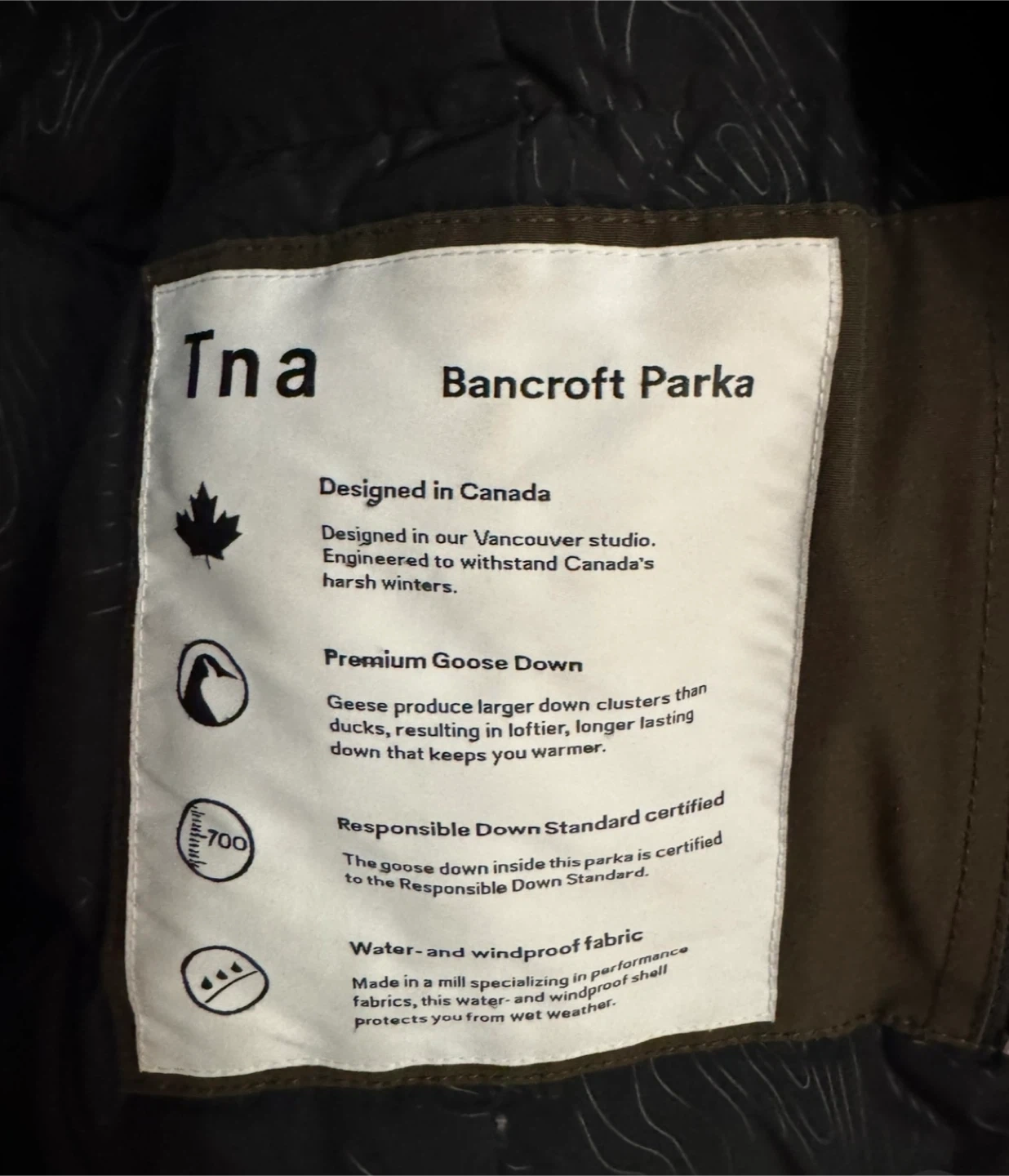 578Selling a TNA Bancroft Parka in size XL. It's designed in Canada and engineered to withstand Canada's harsh climate. Features: - Premium Goose Down: Geese produce larger down clusters than ducks, creating a stronger, longer-lasting down that keeps you warmer - Responsible Down Standard certified - Water- and windproof fabric Like new Purchased for $340 plus tax Asking $160 Yonge and finch area