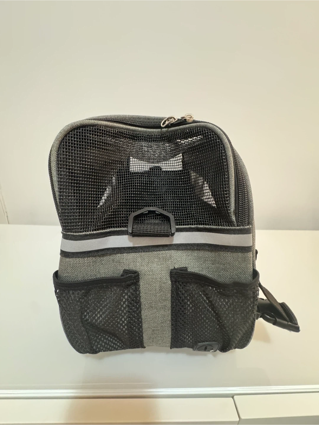 5. 2 elastic mesh pockets. One cable outlet. Half mesh window zippered to confirm pets. Night time reflection strip. Shoulder strap attachment.