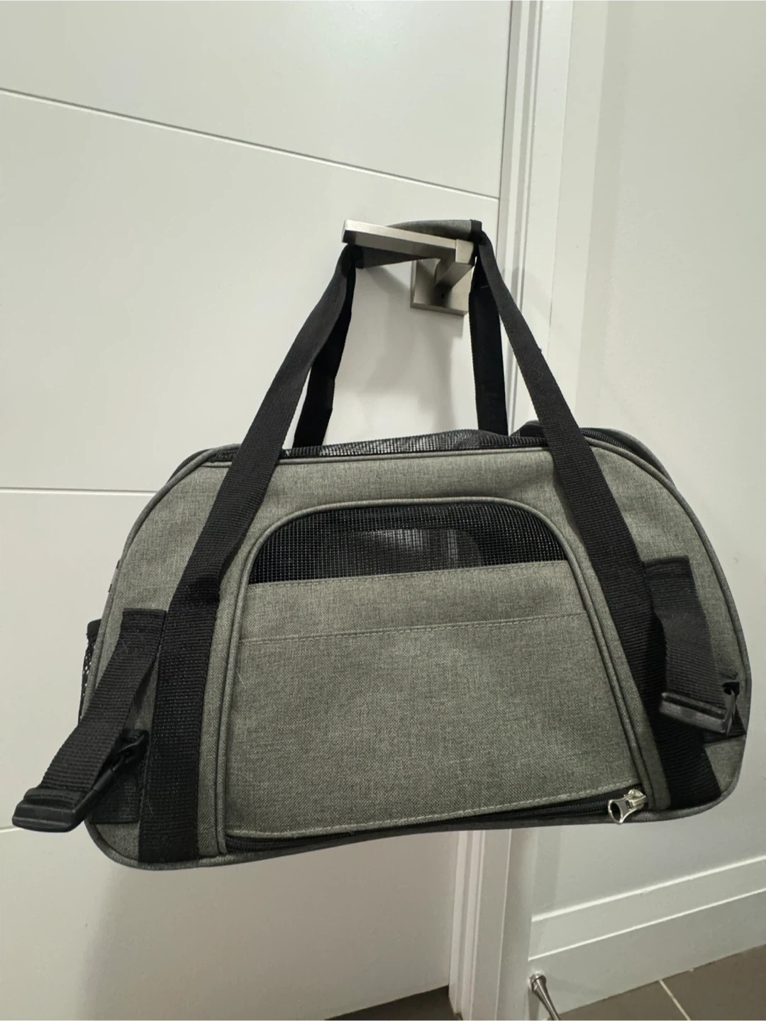 Used. Pet cat outgrew this carrier. Very travel friendly. Has not been in use for 1 year. Vacuumed and cleaned. No fleas. Zipper tags have been removed because cat liked to chew on it. Everything else was immune to cat damage.