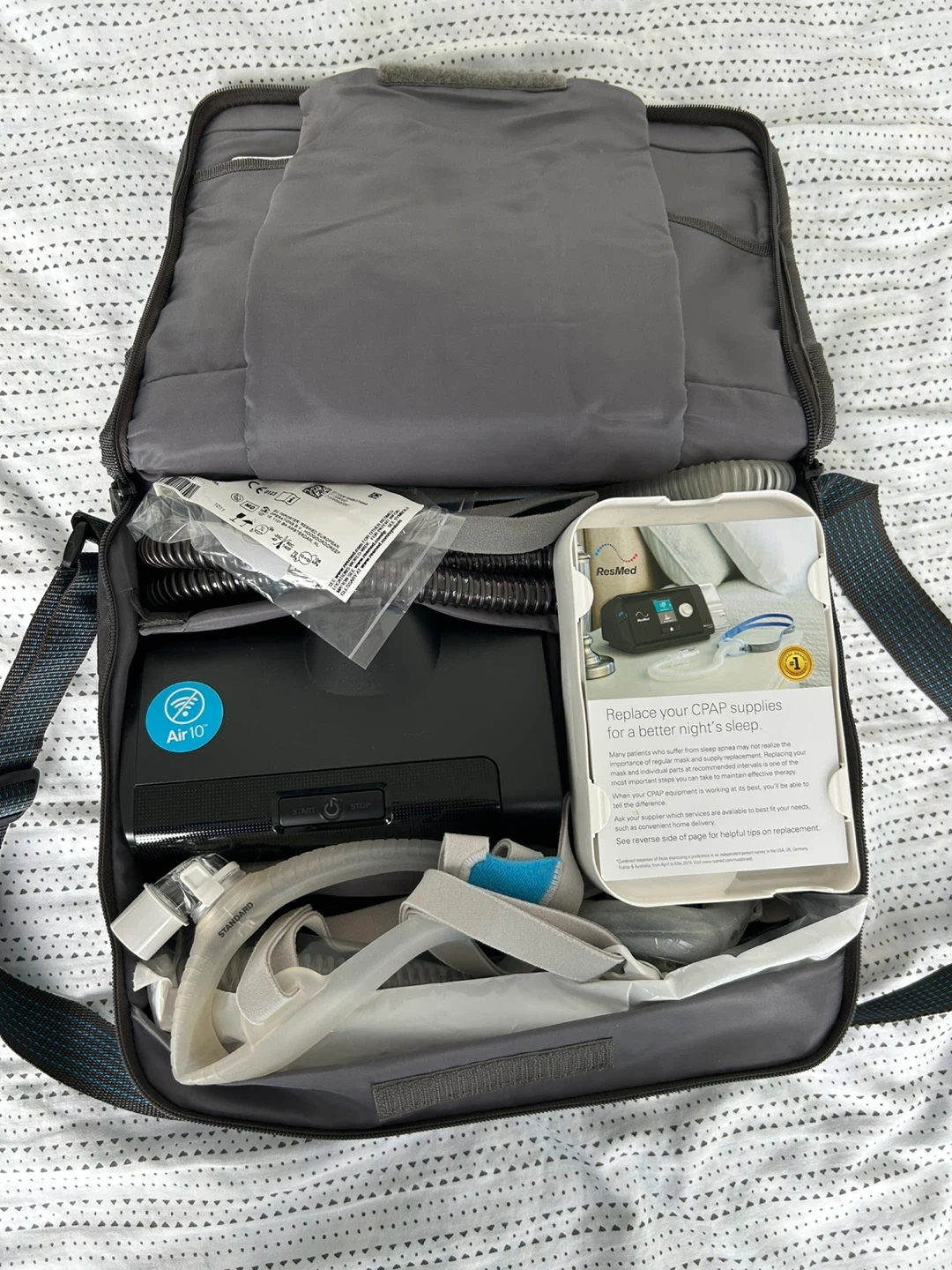 Selling a like-new ResMed Air10 CPAP machine. It comes with its carrying bag and all the necessary components. It's in great condition and ready to help you get a good night's sleep!