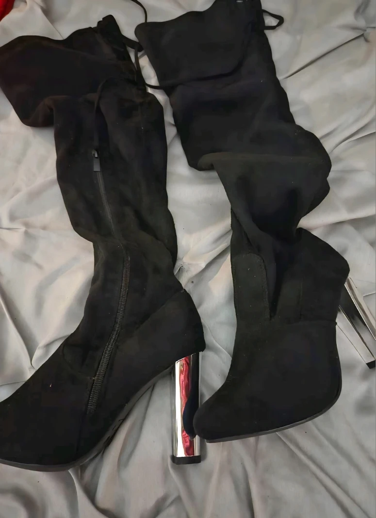Selling a pair of black thigh-high boots in size 8 but fit ore like a 7 They have a unique silver heel and are made of a soft, suede-like material.