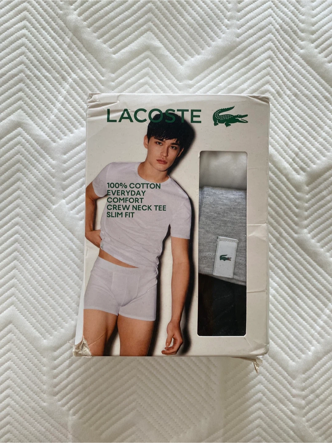 Selling a pack of Lacoste crew neck tees in slim fit! The shirts are made of 100% cotton. This pack includes three shirts. Size XS.