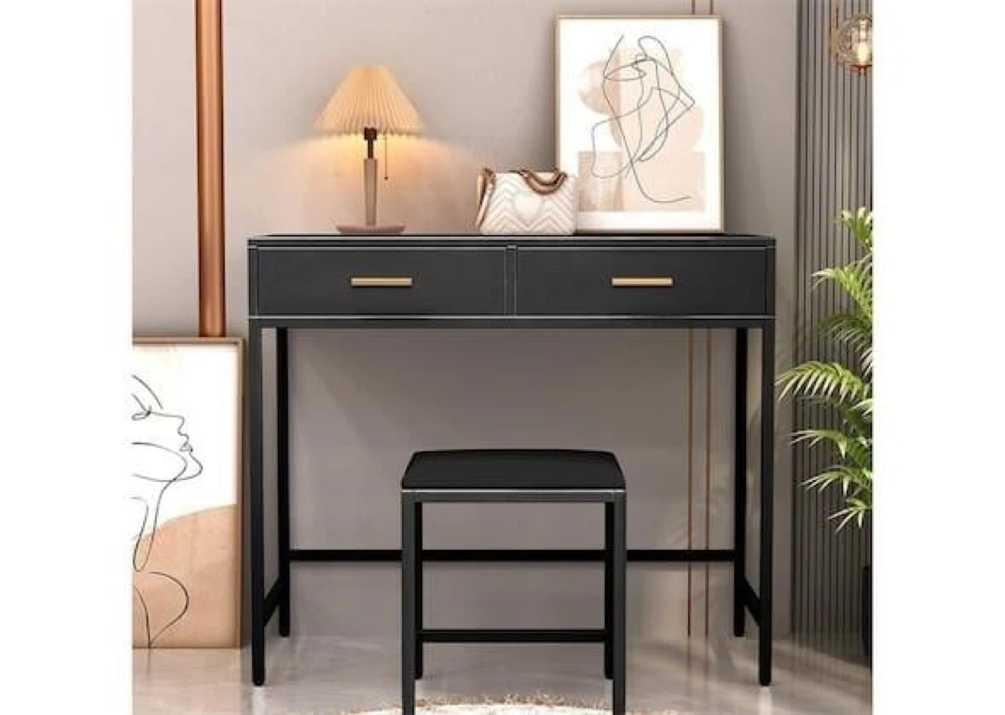 Looking to add a touch of elegance to your space? I'm selling a stylish black vanity table complete with a matching stool. The sleek design features drawers with gold handles, offering both storage and a modern aesthetic. Perfect for creating your own personal beauty corner!