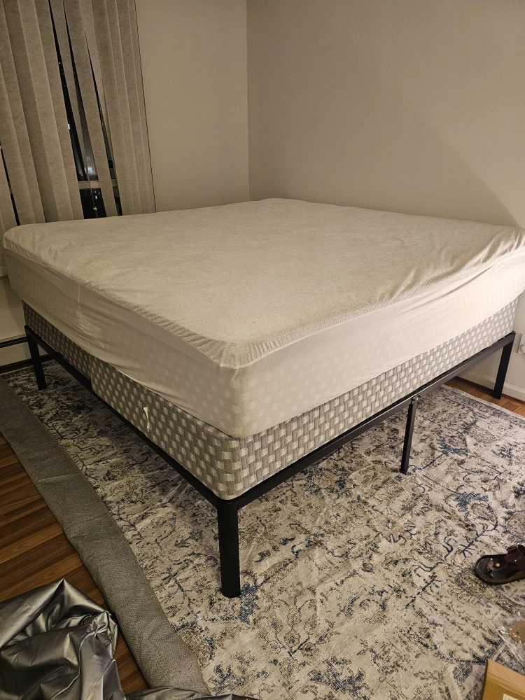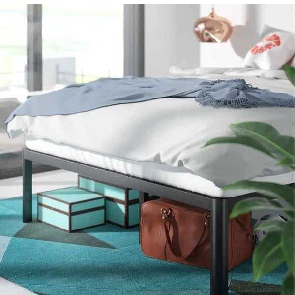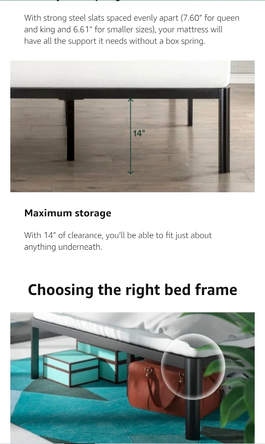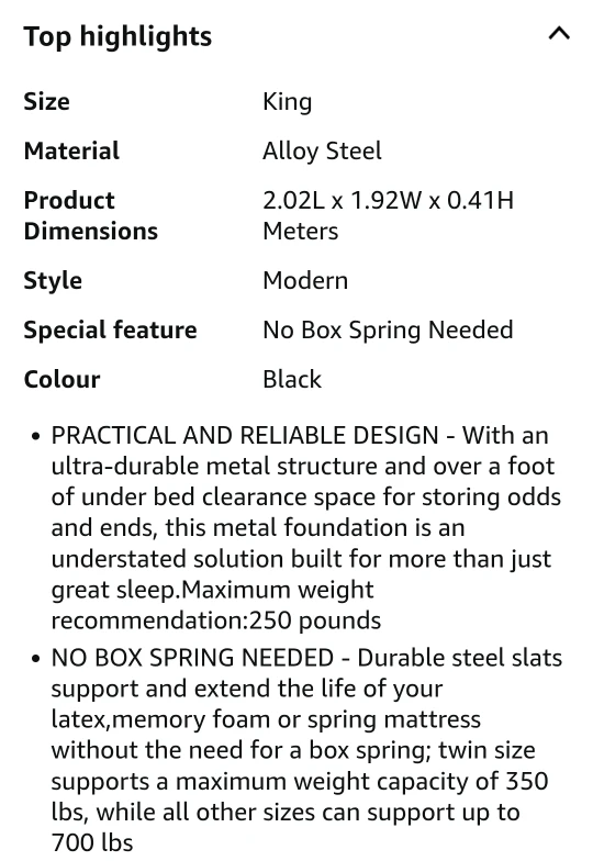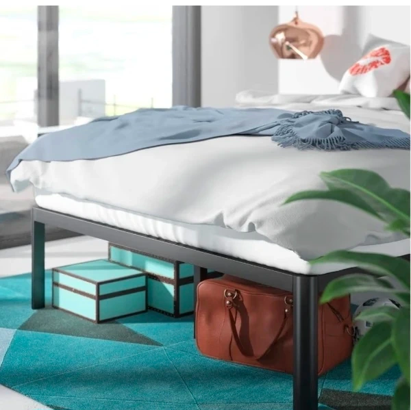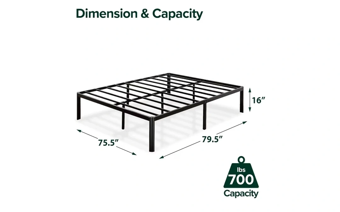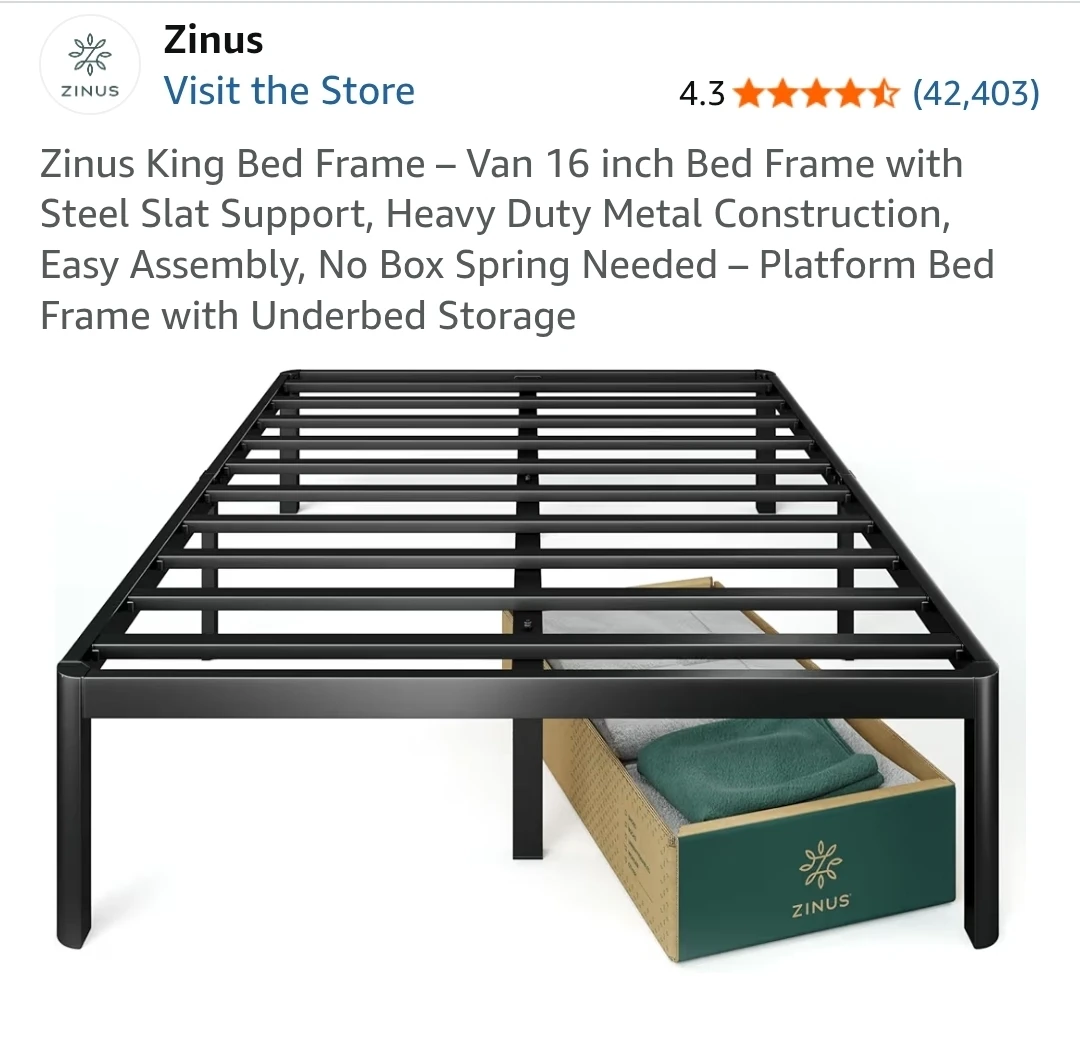 Selling a Zinus King bed frame only (mattress not for sale), the 'Van' model with a 16-inch height. It's black and made of alloy steel. This platform bed frame features heavy-duty metal construction and steel slat support, so no box spring is needed! The dimensions are 2.02L x 1.92W x 0.41H meters. It also offers underbed storage.